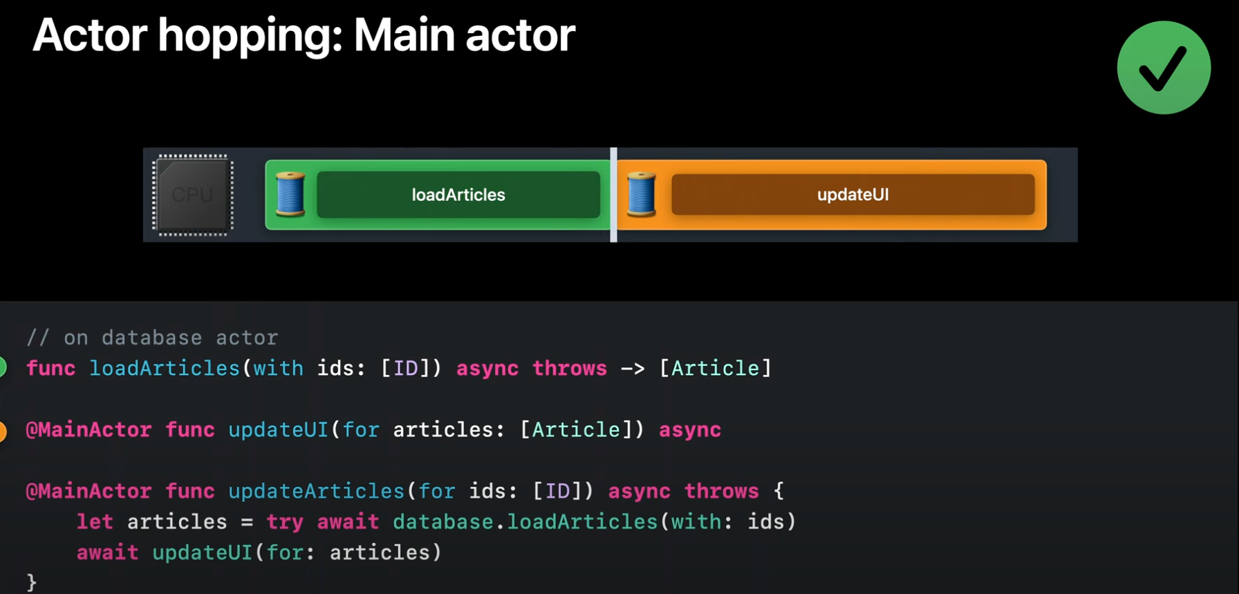 Cooperative pool 내에서 Actor 간의 전환은 빠르긴 하지만, MainActor와의 이동에는 주의해야 함.