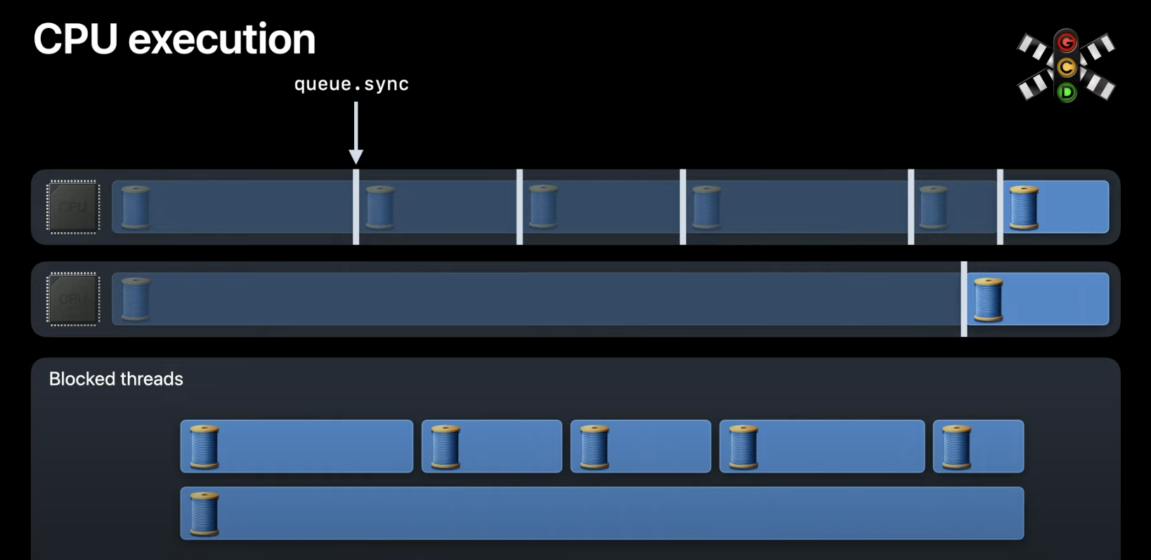 만약 첫 번째 스레드가 차단되고, Concurrent에서 수행해야 할 작업이 더 많은 경우 GCD는 남아 있는 작업을 비우기 위해서 더 많은 스레드를 가져오는데, 두 가지 이유가 존재함.