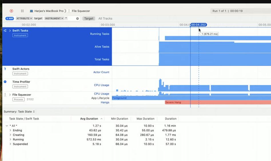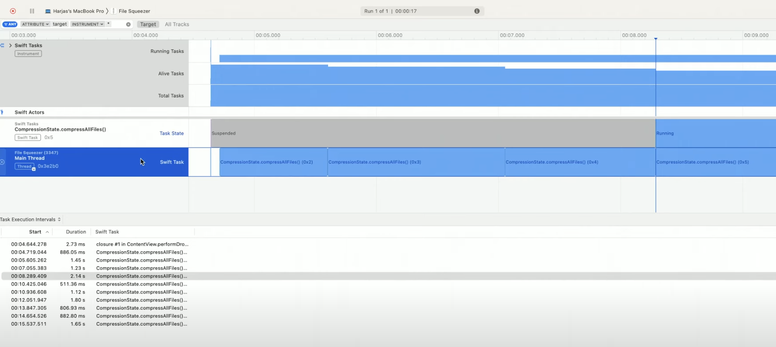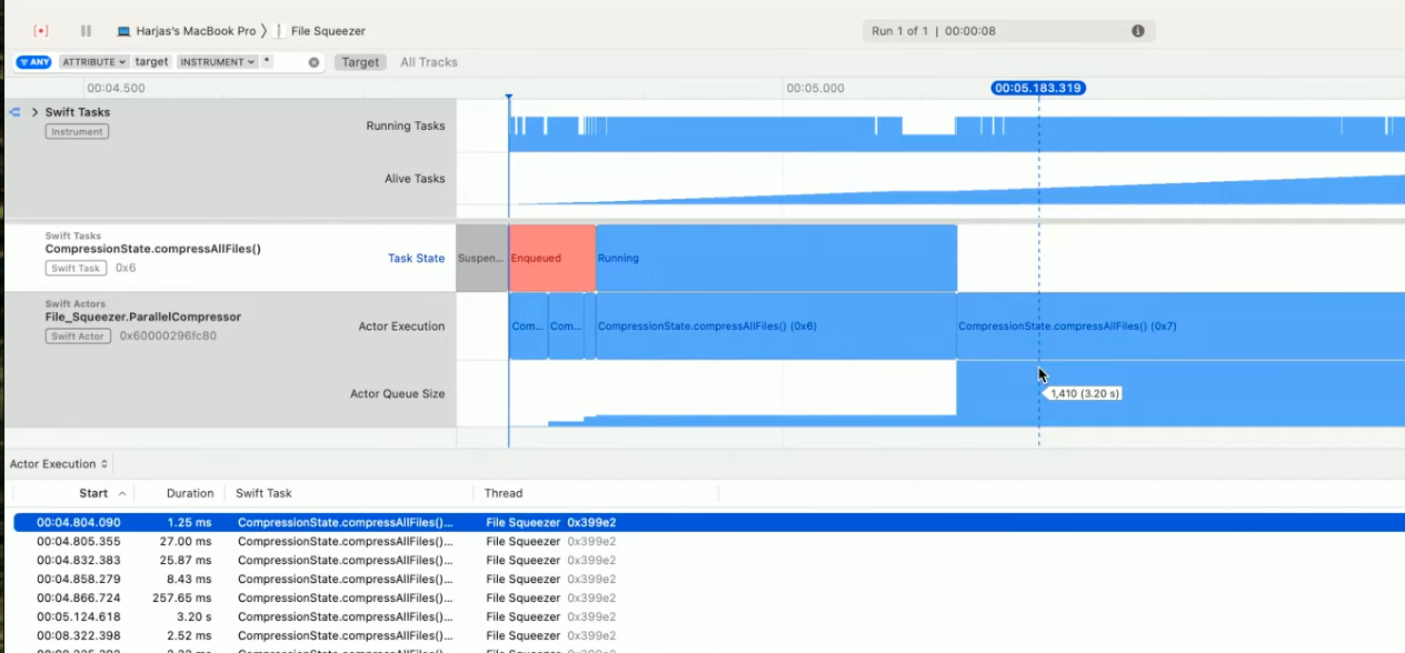 개선된 결과를 instruments를 통해 확인해 보면 대부분 task는 ParallelCompressor Actor에서 매우 짧은 시간 동안만 실행되었고, queue size는 일정 수준을 넘지 않음.