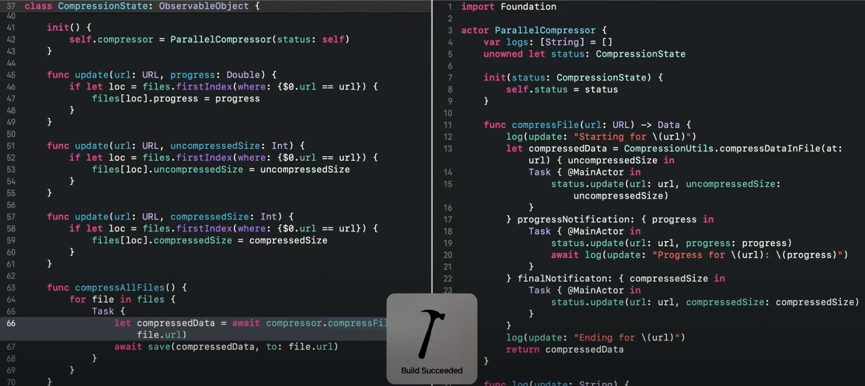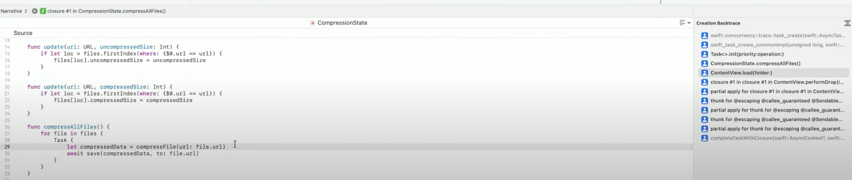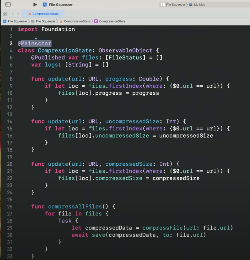 이를 해결하기 위해서는 compressFile(url: URL)를 분리된 task로 가져가야 하며, 이를 통해 mutable 상태를 업데이트하는데 필요한 기간도 동안에만 분리된 Task를 수행할 수 있음.