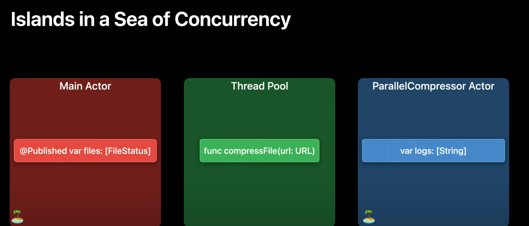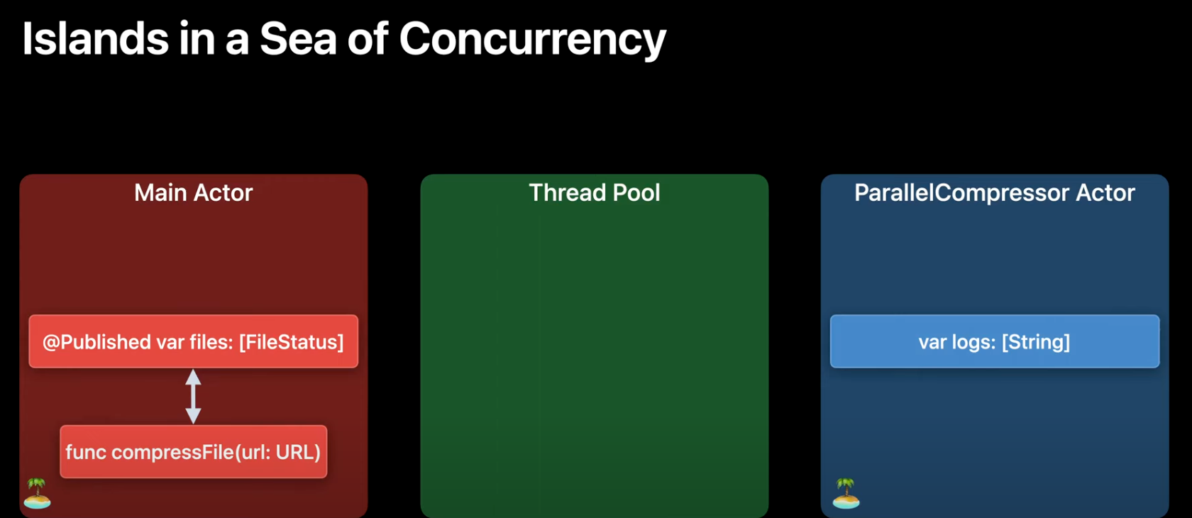 compressFile 메서드에 nonisolated를 표시하는 것은 해당 Actor의 상태에 대해서접근할 필요가 없다고 Swift 컴파일러에게 알려주는 것이지만, 해당 코드에서는 사용하고 있음.