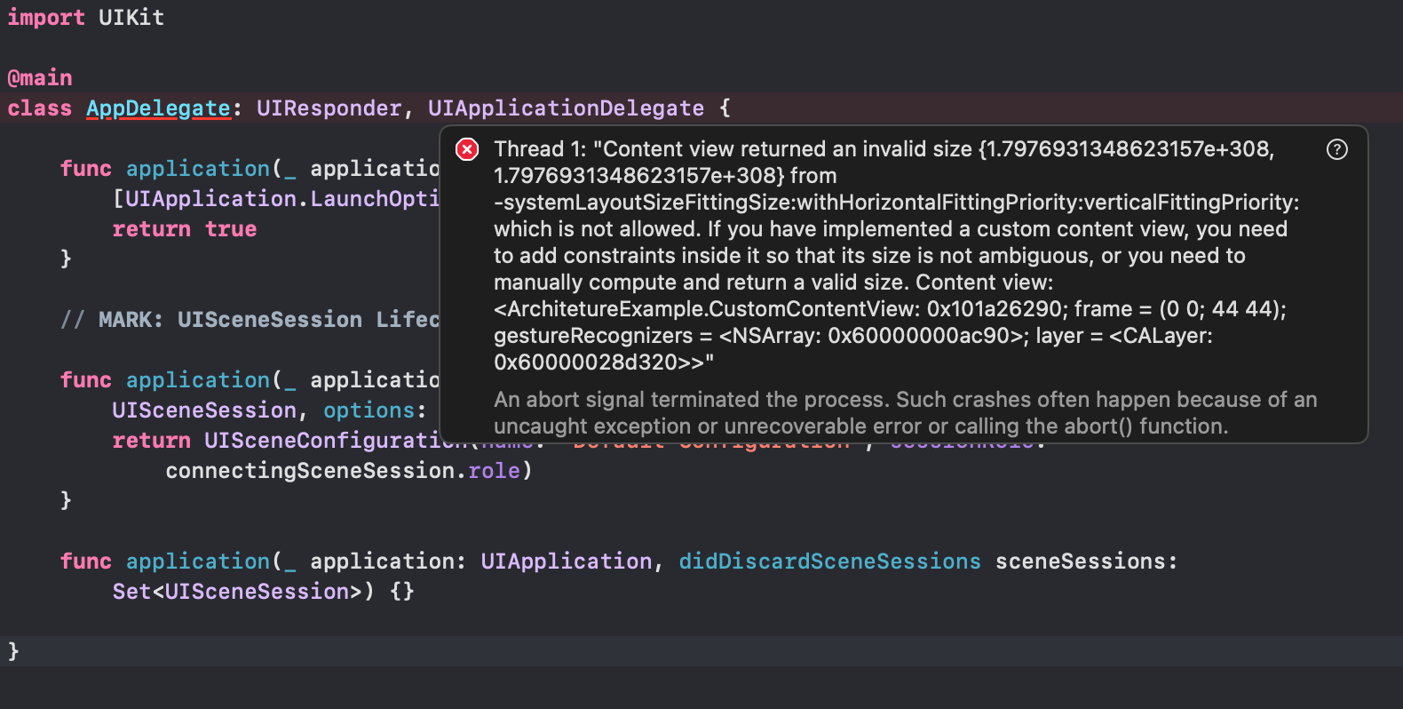 *** Terminating app due to uncaught exception 'NSInternalInconsistencyException', reason: 'Content view returned an invalid size {1.7976931348623157e+308, 1.7976931348623157e+308} from -systemLayoutSizeFittingSize:withHorizontalFittingPriority:verticalFittingPriority: which is not allowed. If you have implemented a custom content view, you need to add constraints inside it so that its size is not ambiguous, or you need to manually compute and return a valid size. Content view: <ArchitetureExample.CustomContentView: 0x102606570; frame = (0 0; 44 44); gestureRecognizers = <NSArray: 0x600000014690>; layer = <CALayer: 0x6000002454e0>>'