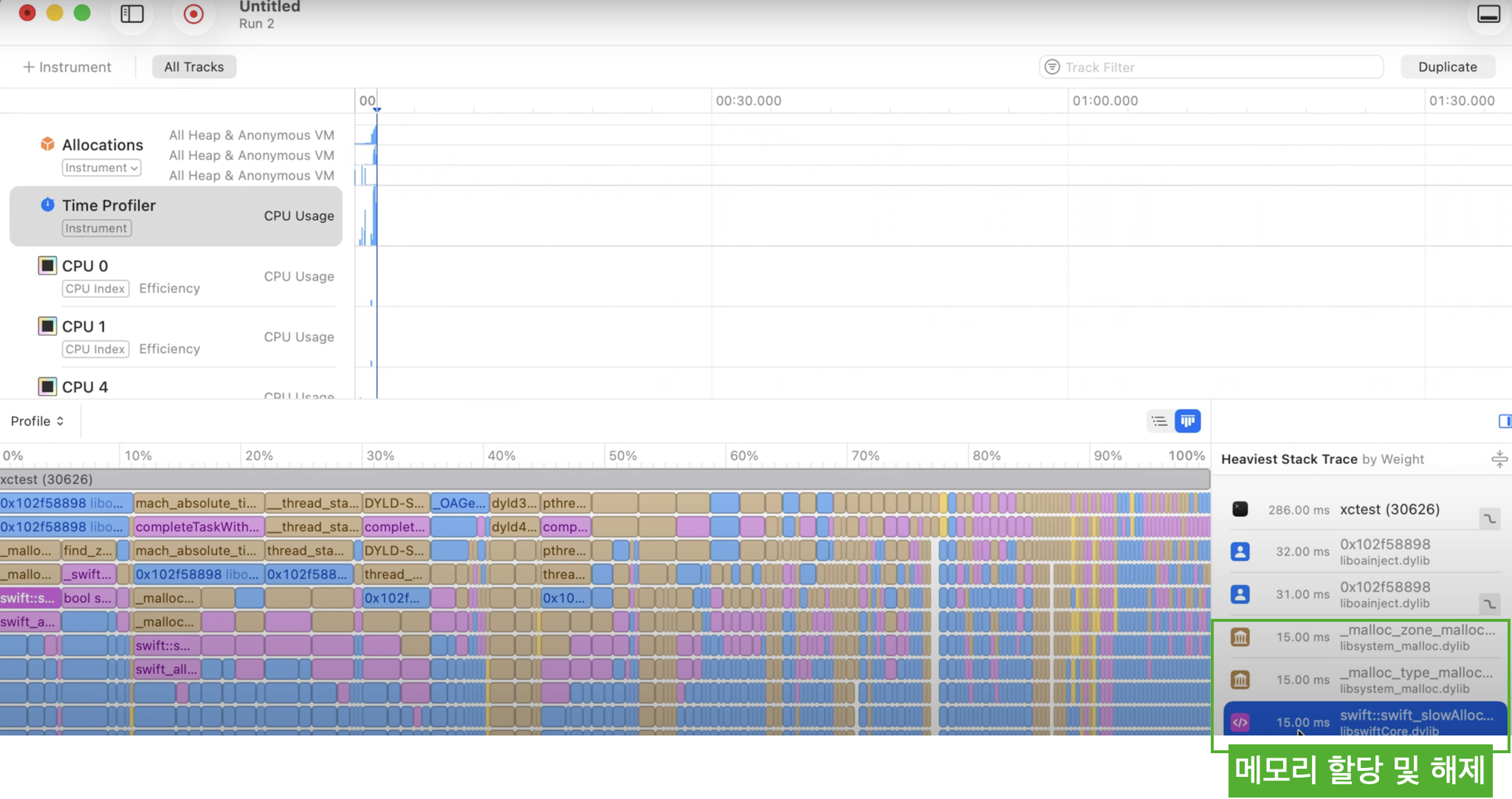 Swift 배열을 할당하고 해제하는 메서드에 많은 트래픽이 발생하고 있음을 보여줌.