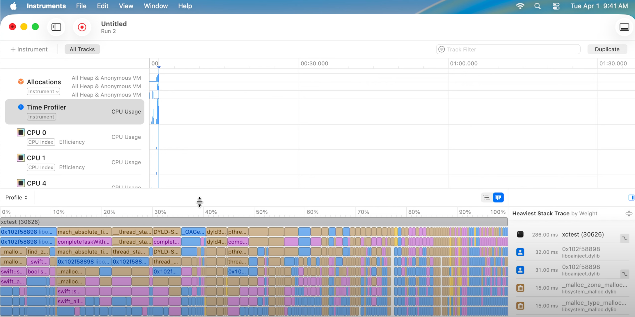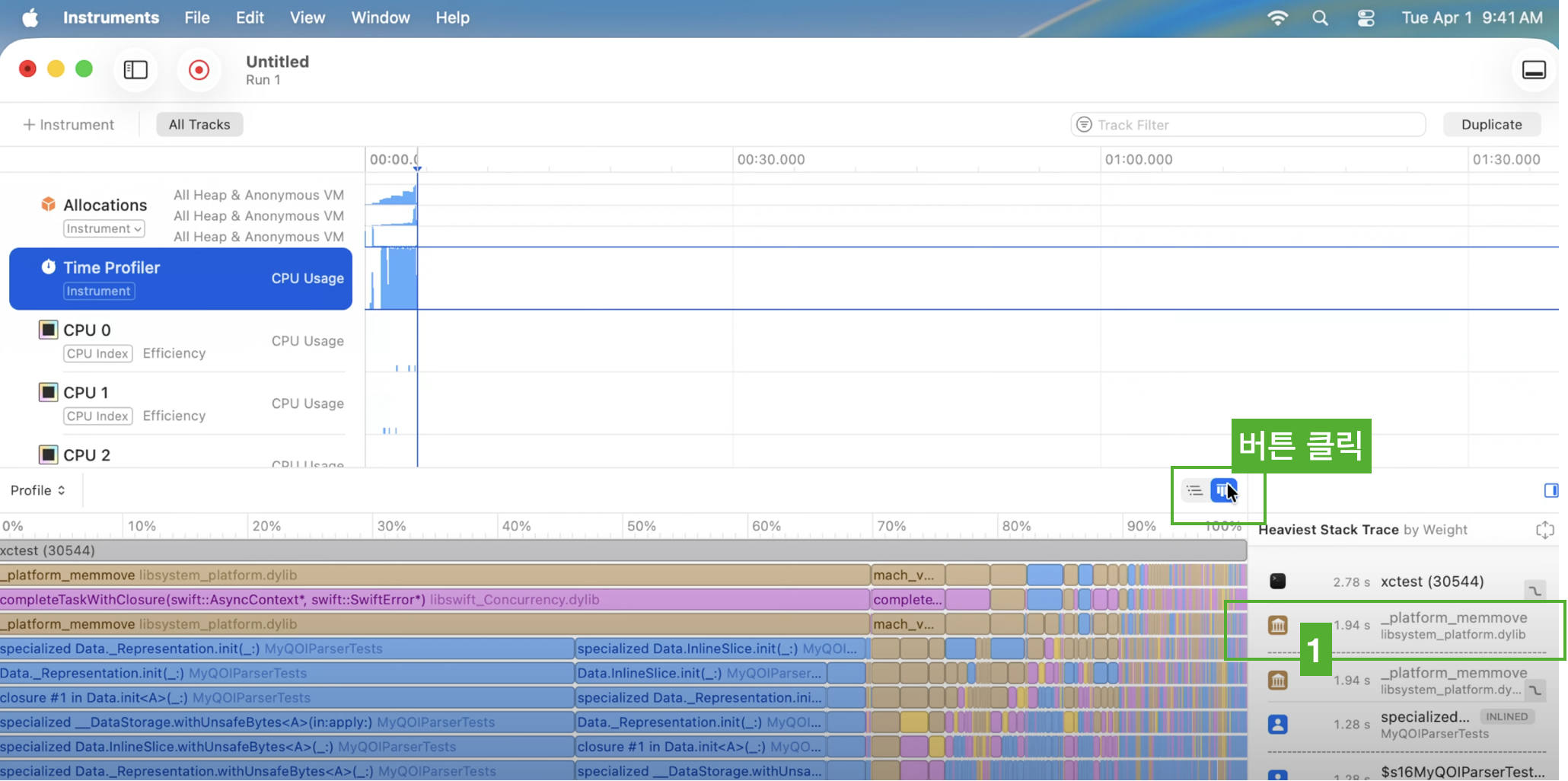이렇게 테스트를 작성하면 정확성을 확인하는 것은 물론 Instruments에서 테스트의 성능도 확인할 수 있음.