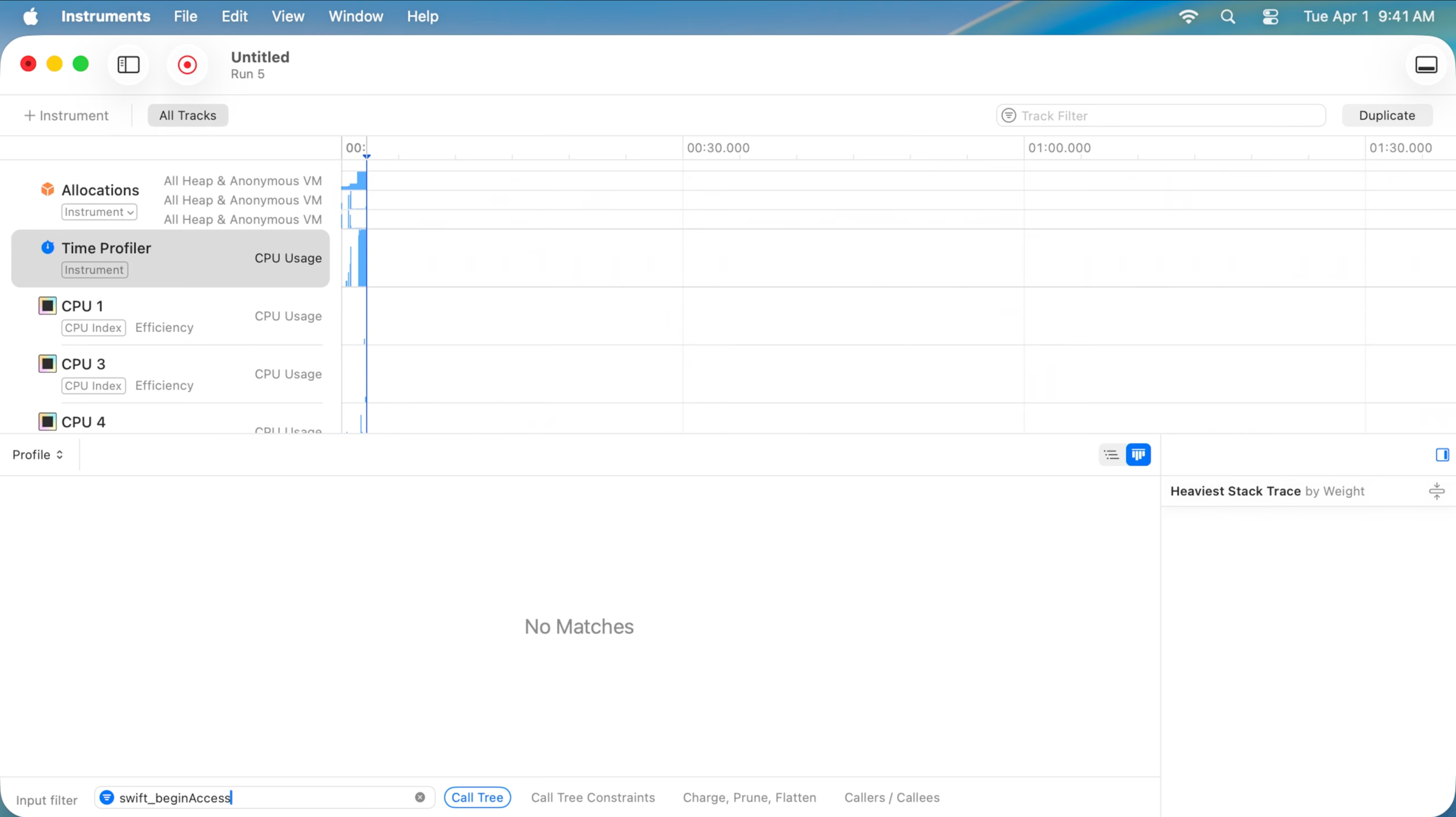 배타성 테스트(Exclusivity tests)는 Trace에서 'swift_beginAccess' 및 'swiftendAccess' 기호로 표시됨.