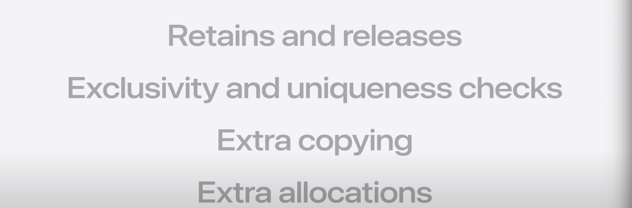 `Data`나 `Array`와 같이 high-level Collection 타입에서 reference counting explosion을 야기하지 않는 걸로 전환해야 함.