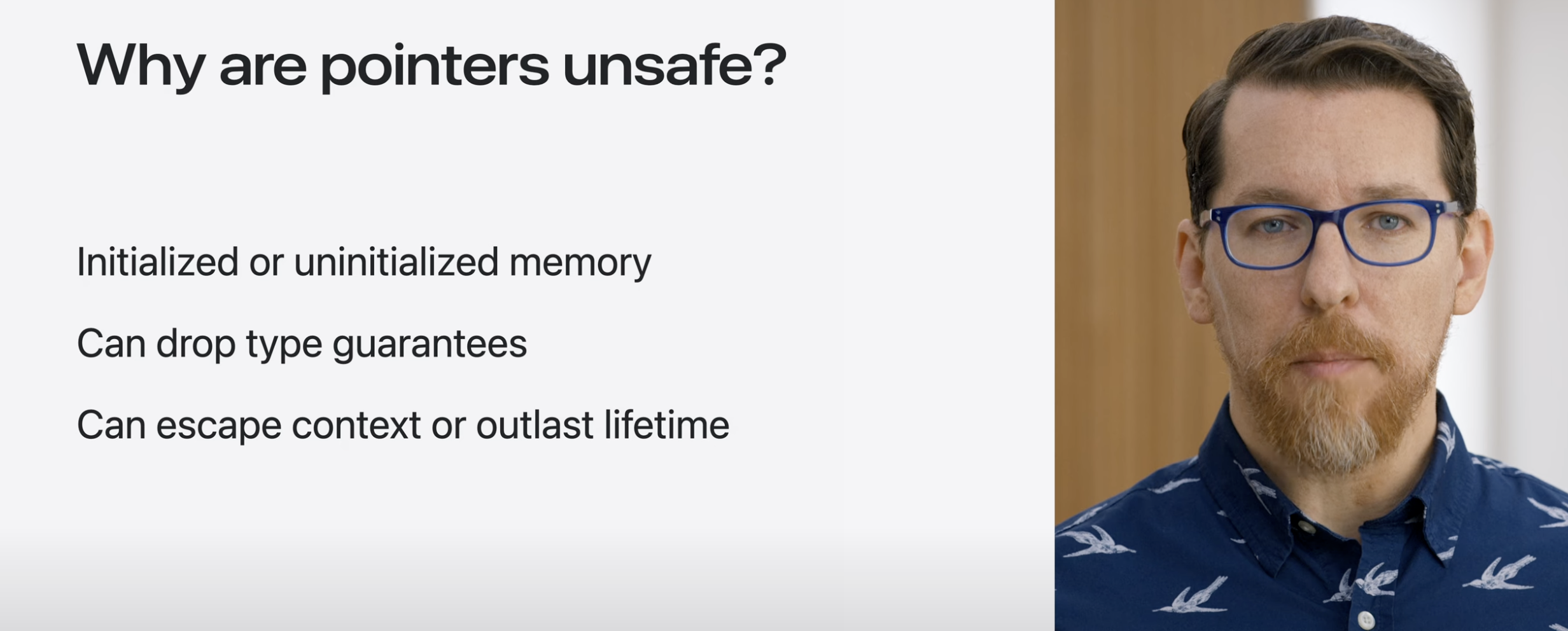 Pointer가 안전하지 않은 이유는 Swift에서는 언어의 안정성 보장을 우회하기 때문에 안전하지 않다고 부름.