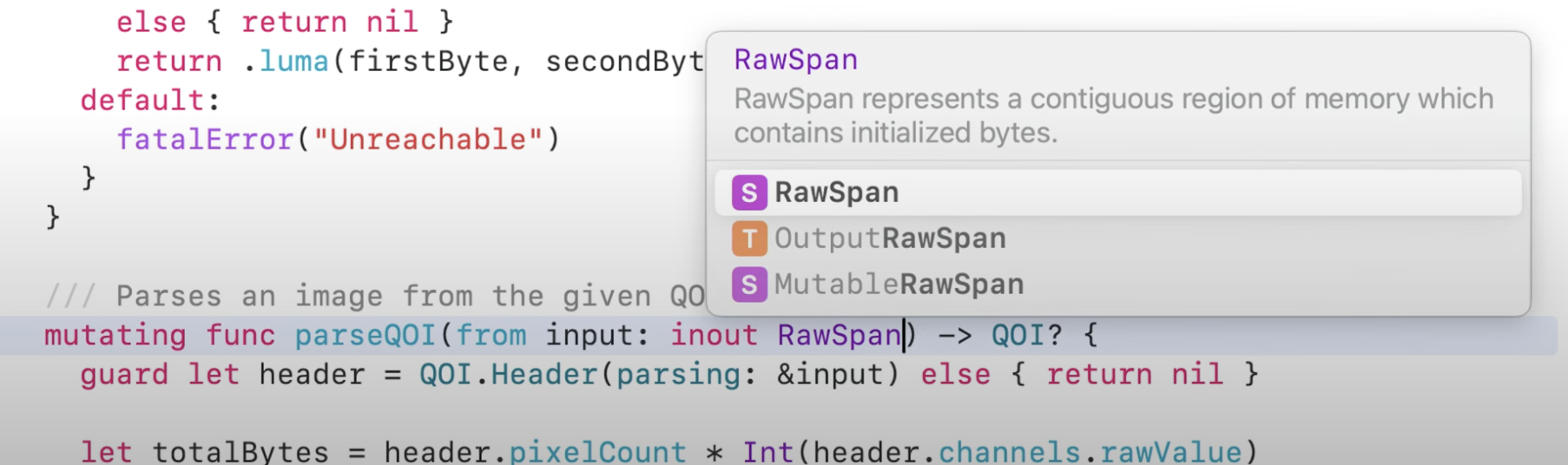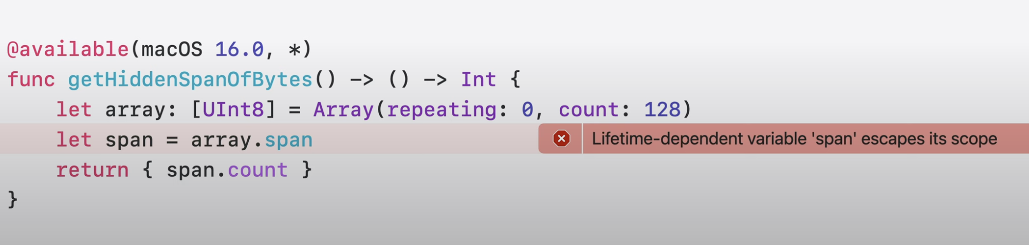 'Span'이 중요한 점은 ~Escapable 언어 기능을 사용해 컴파일러는 `Span`의 수명을 `Span`을 제공하는 Collection에 연결할 수 있음.