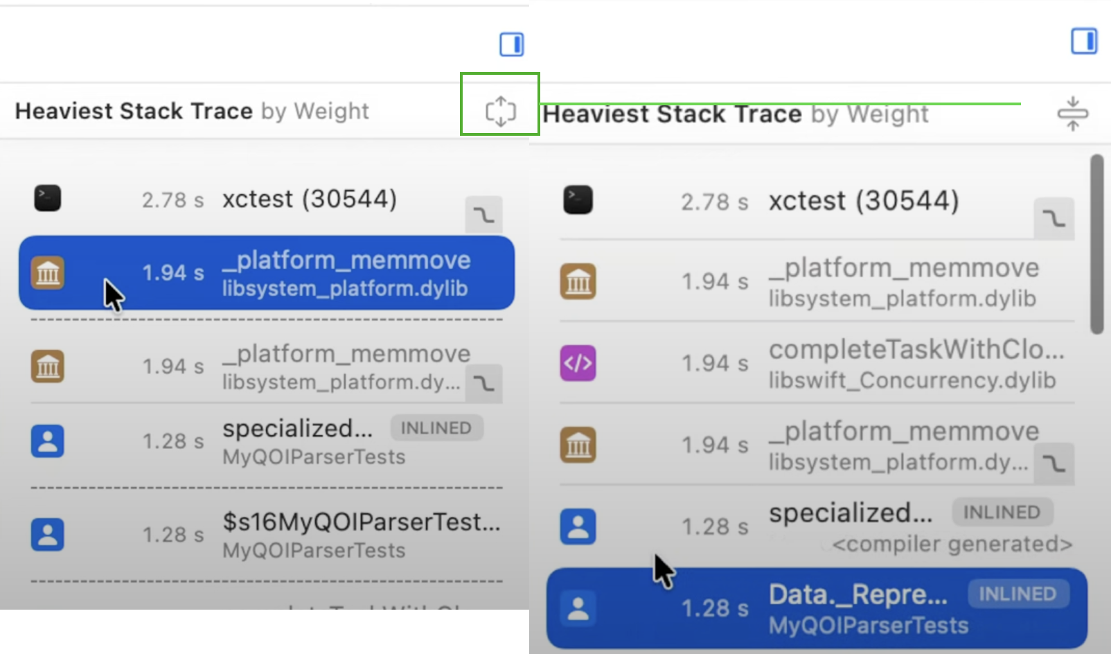 'swift_release' 샘플로 돌아가서 Stack Trace에서 가장 무거운 사용자 정의 메서드를 찾음.