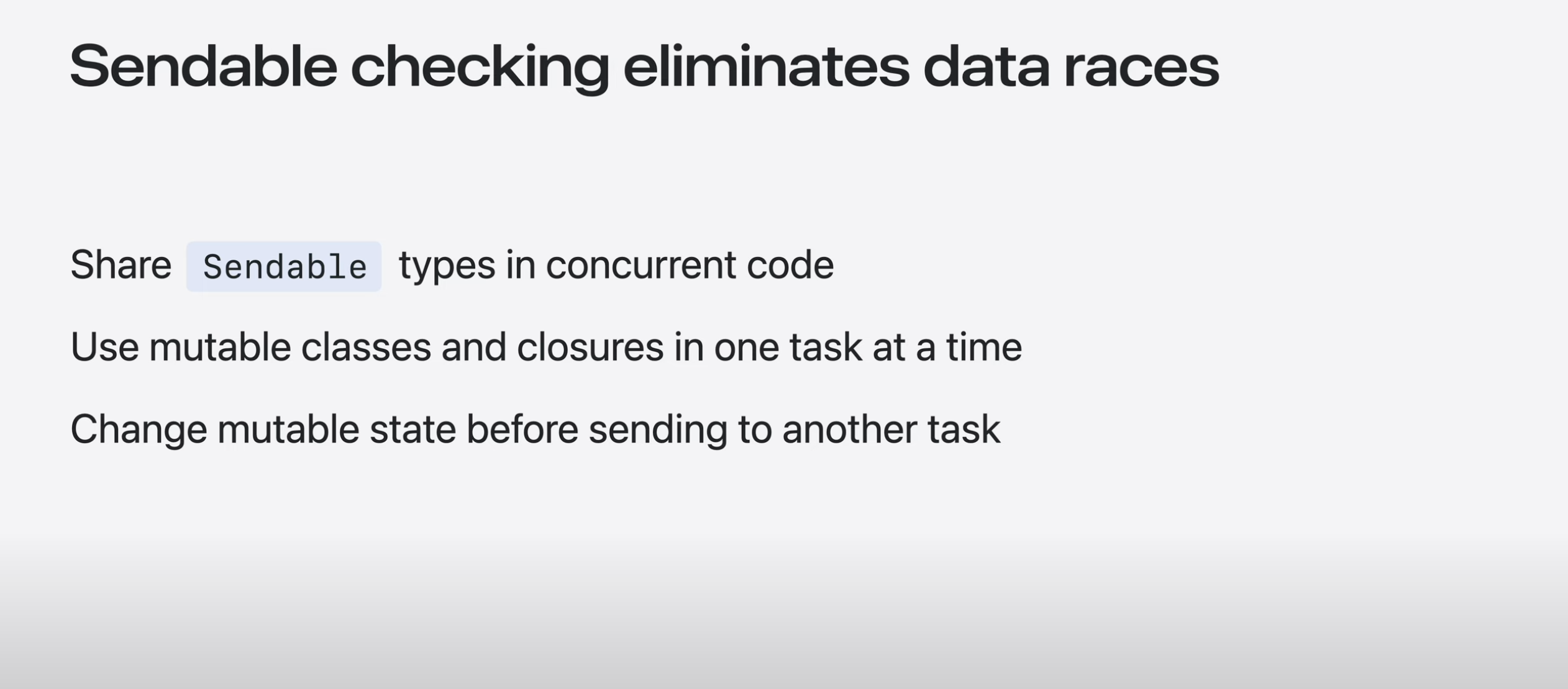 Swift Concurreny는 Sendable이 아닌 타입을 공유하려고 할 때 컴파일러 오류로 인해 데이터 경쟁을 방지함.