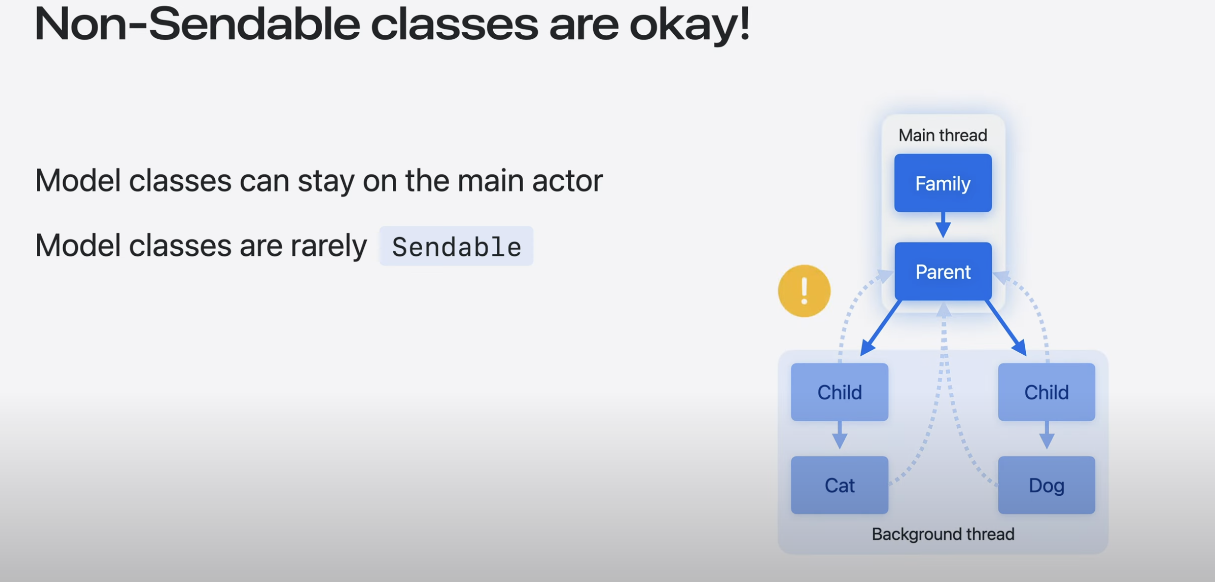 - 모델 클래스는 일반적으로 UI가 있는 MainActor에 있거나, non-Sendable이므로 동시 접근이 많이 발생하지 않음.