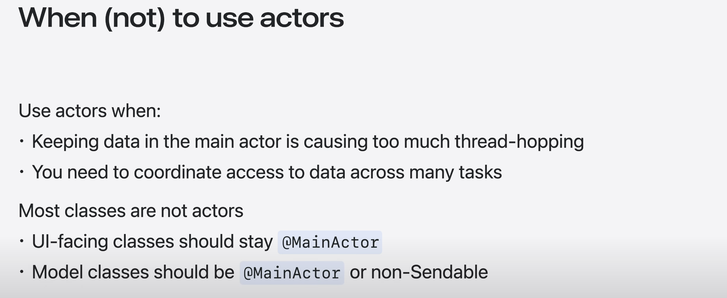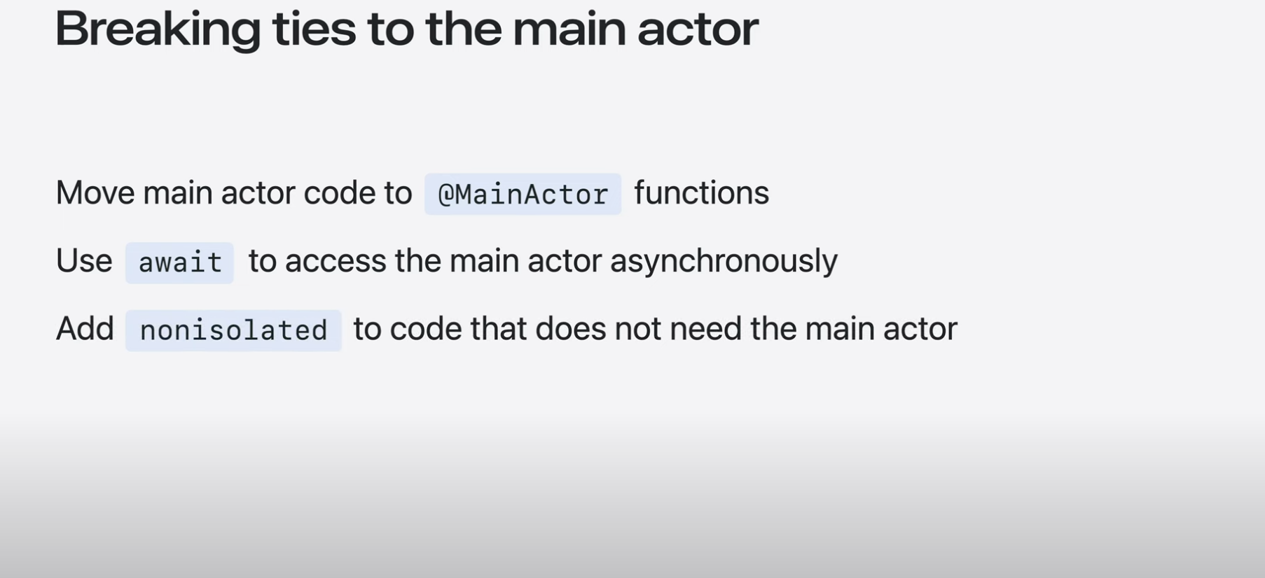 - 코드가 MainActor에 있을 필요가 전혀 없다면 non-isolated 키워드를 추가하여 모든 액터와 분리할 수 있음.