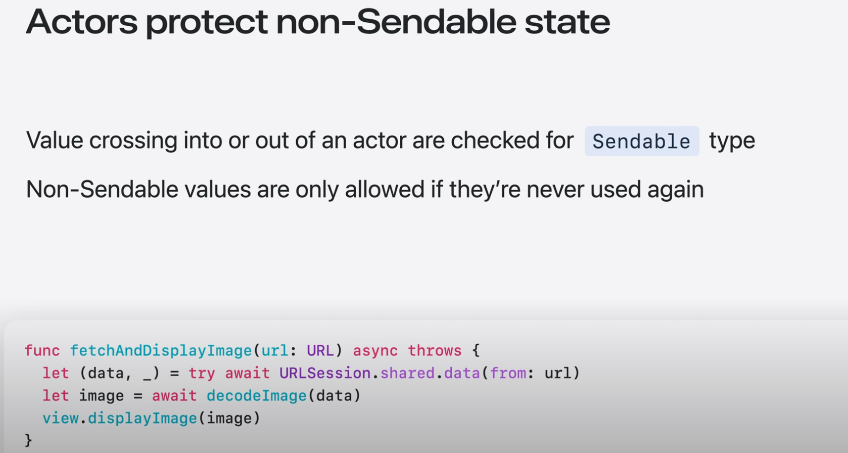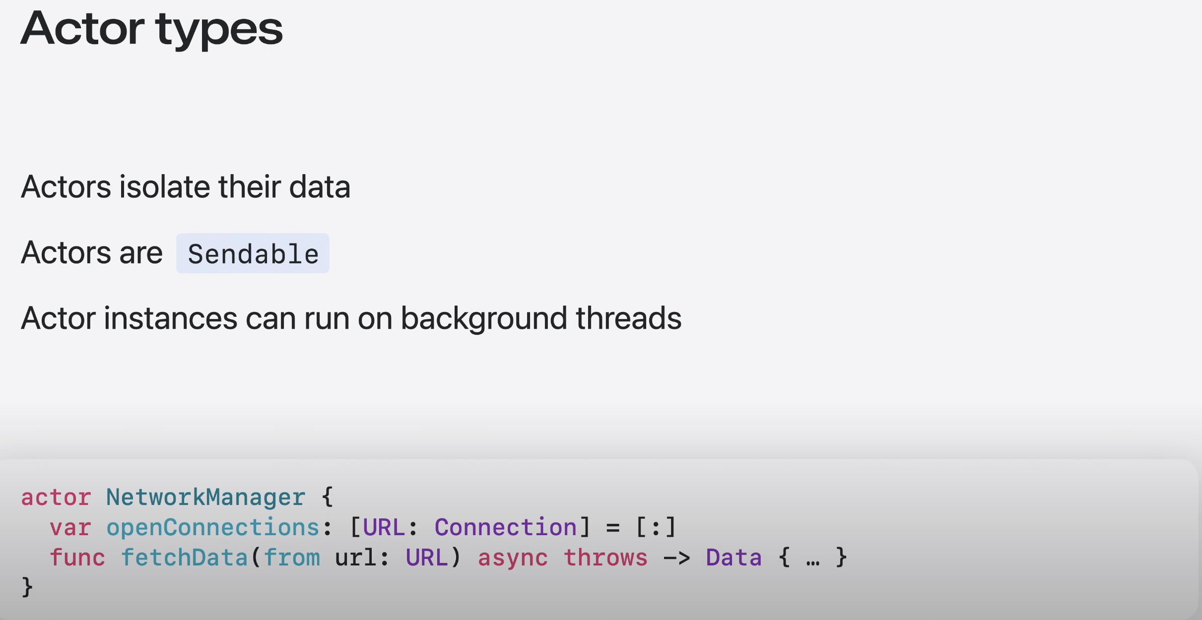 - Actor types도 Sendable이므로 actor 객체를 자유롭게 공유할 수 있음.
