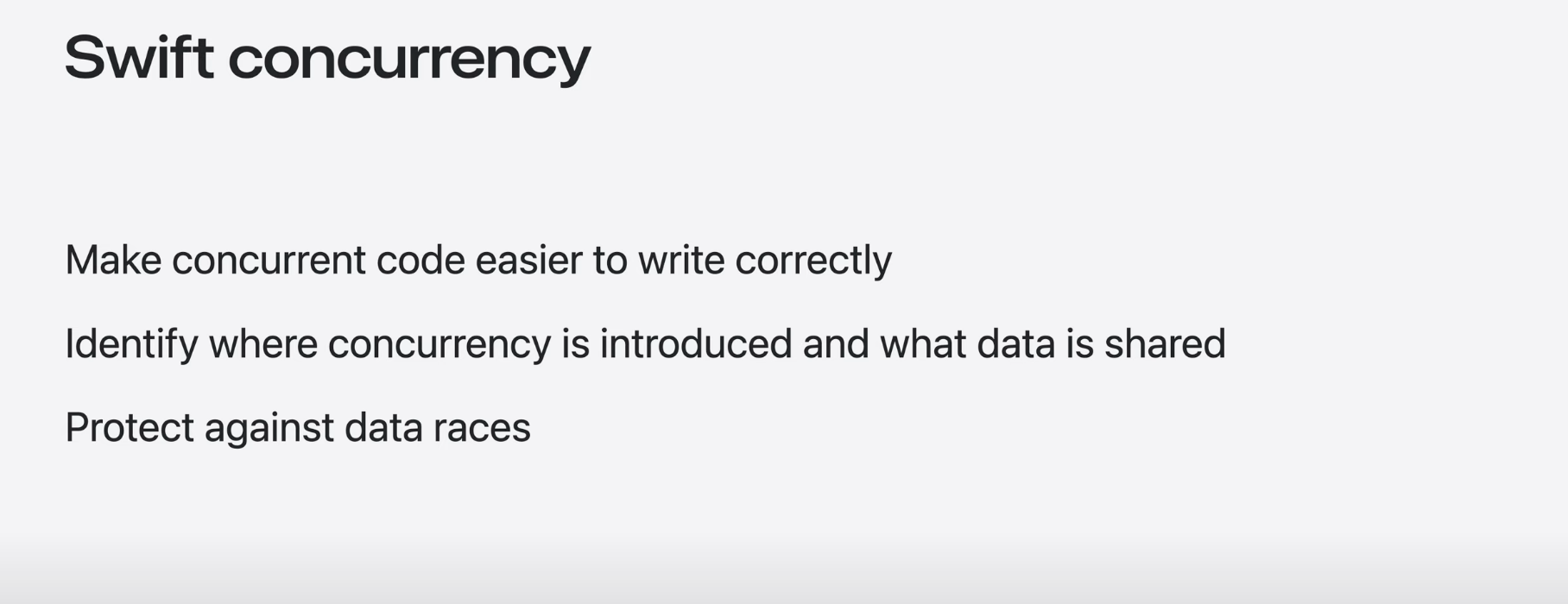 - Swift Concurrency 동시성 모델은 동시성을 사용하는 코드를 올바르게 작성하기 위해 설계되었음.