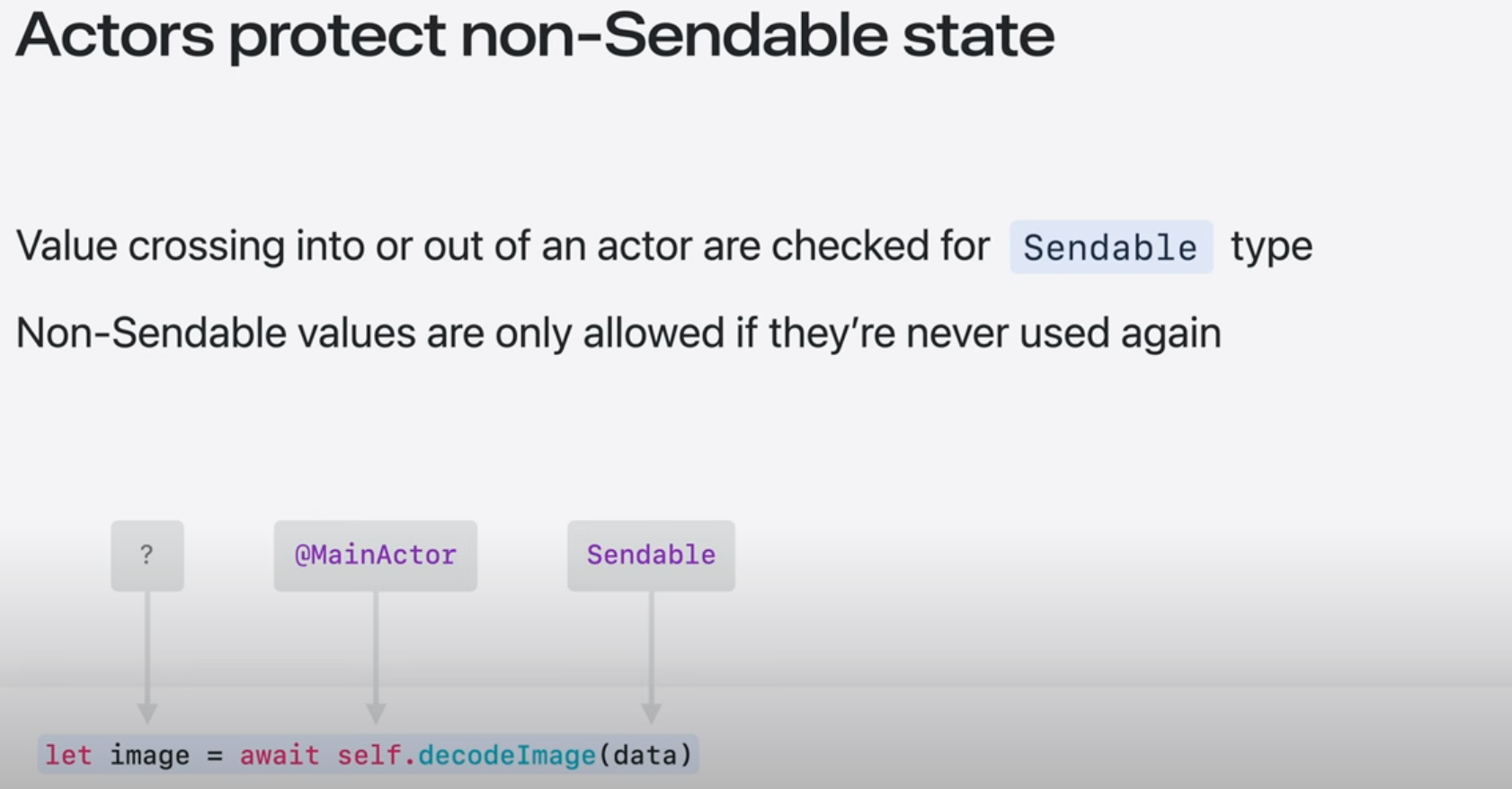 class와 같이 non-sendable 타입은 actor에 의해 보호되는 상태에 접근할 수 없음.