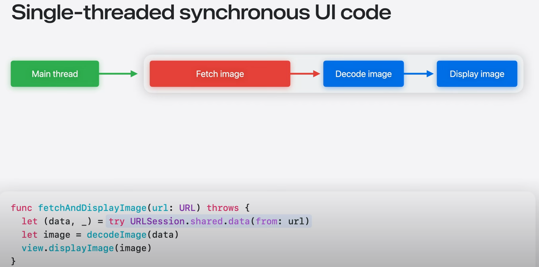 - 단일 스레드 코드가 Swift 동시성과 어떻게 작동하는지 설명.