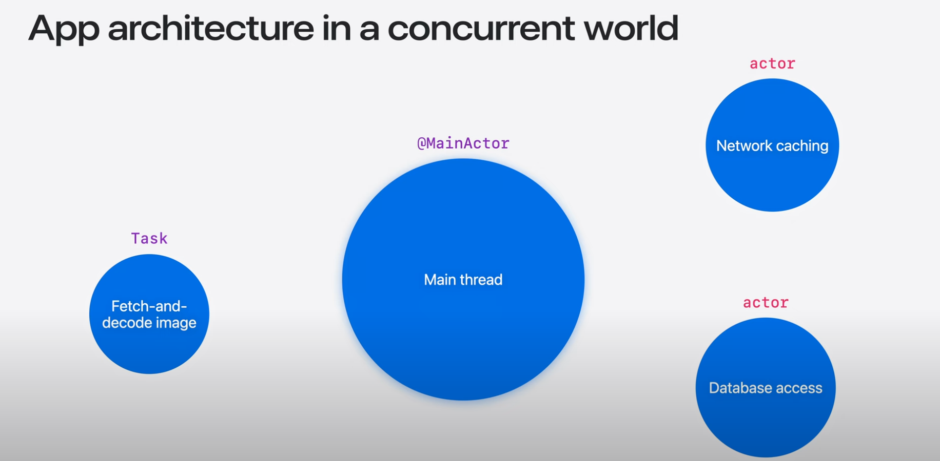 Swift Concurrency는 백그라운드 혹은 메인 스레드에서 실핼되는 동시 작업을 표현하기 위한 actor와 같은 도구를 제공함.