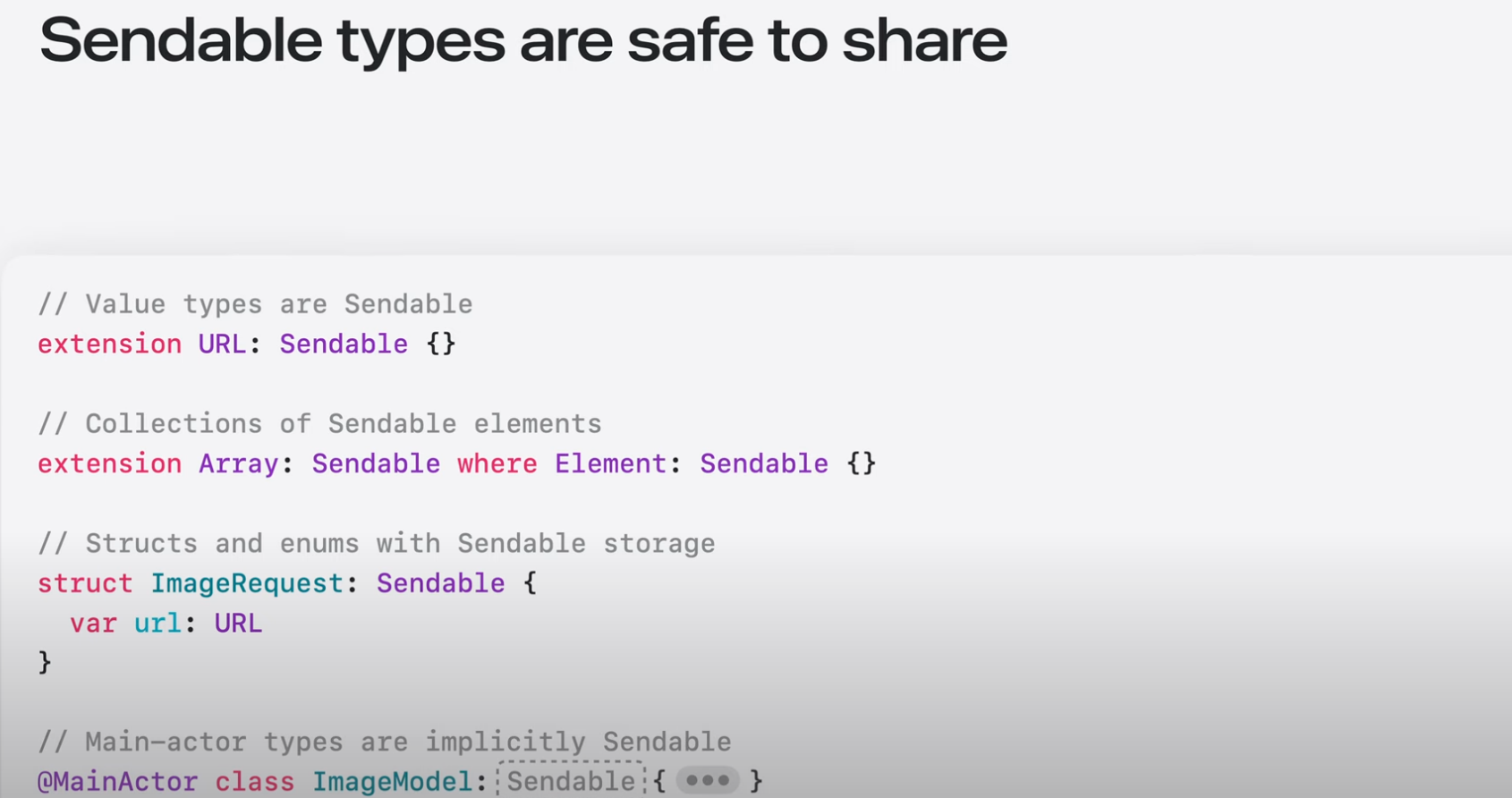 일반적인 코드에서는 공유가능한 대부분의 타입은 Sendable임