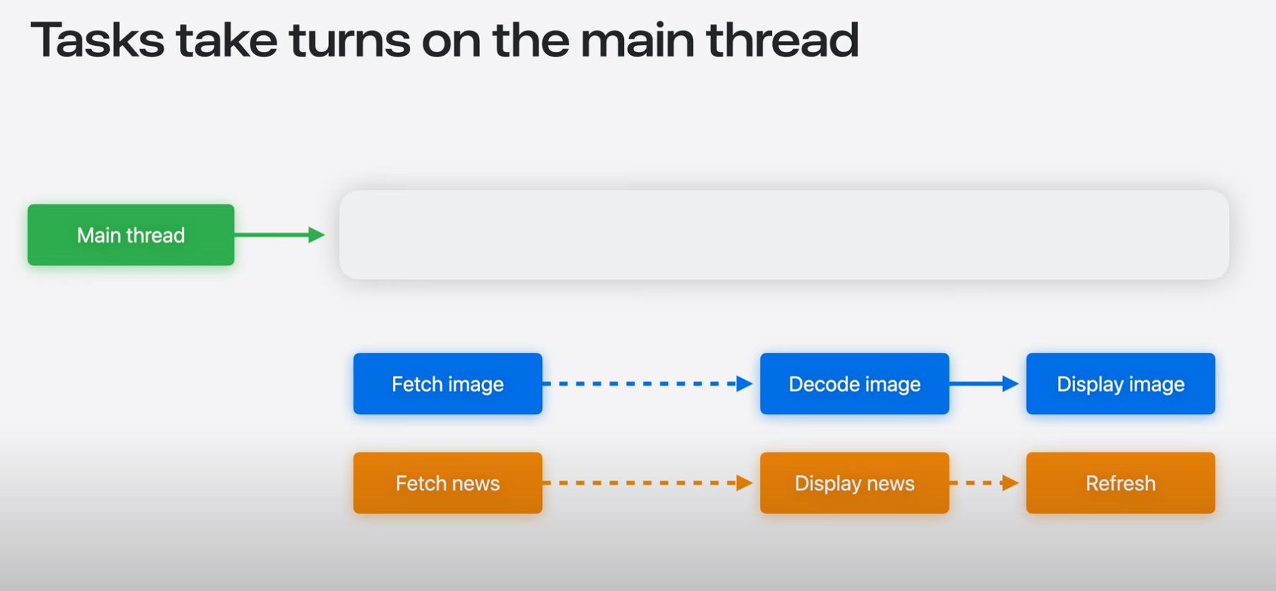 하나의 앱에는 여러가지 동시성이 존재할 수 있음. 각 작업은 백그라운드에서 수행되지만, 각 작업은 메인 스레드에서는 번갈아 가면서 각 작업을 순차적으로 실행해야 함.