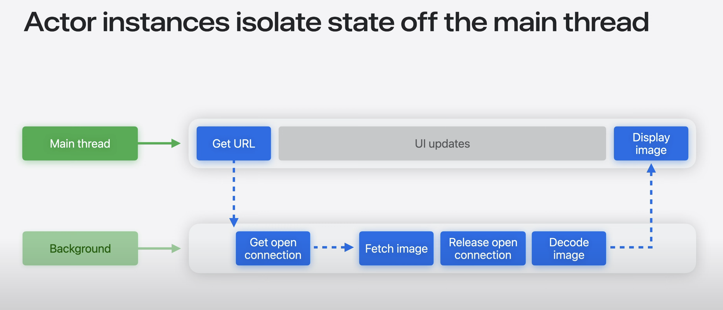 일부 상태를 MainActor에서 Actor 객체로 옮기면 background 스레드에서 더 많은 코드를 실행할 수 있고, 메인스레드를 열어둔 채 UI응답성을 유지할 수 있음.