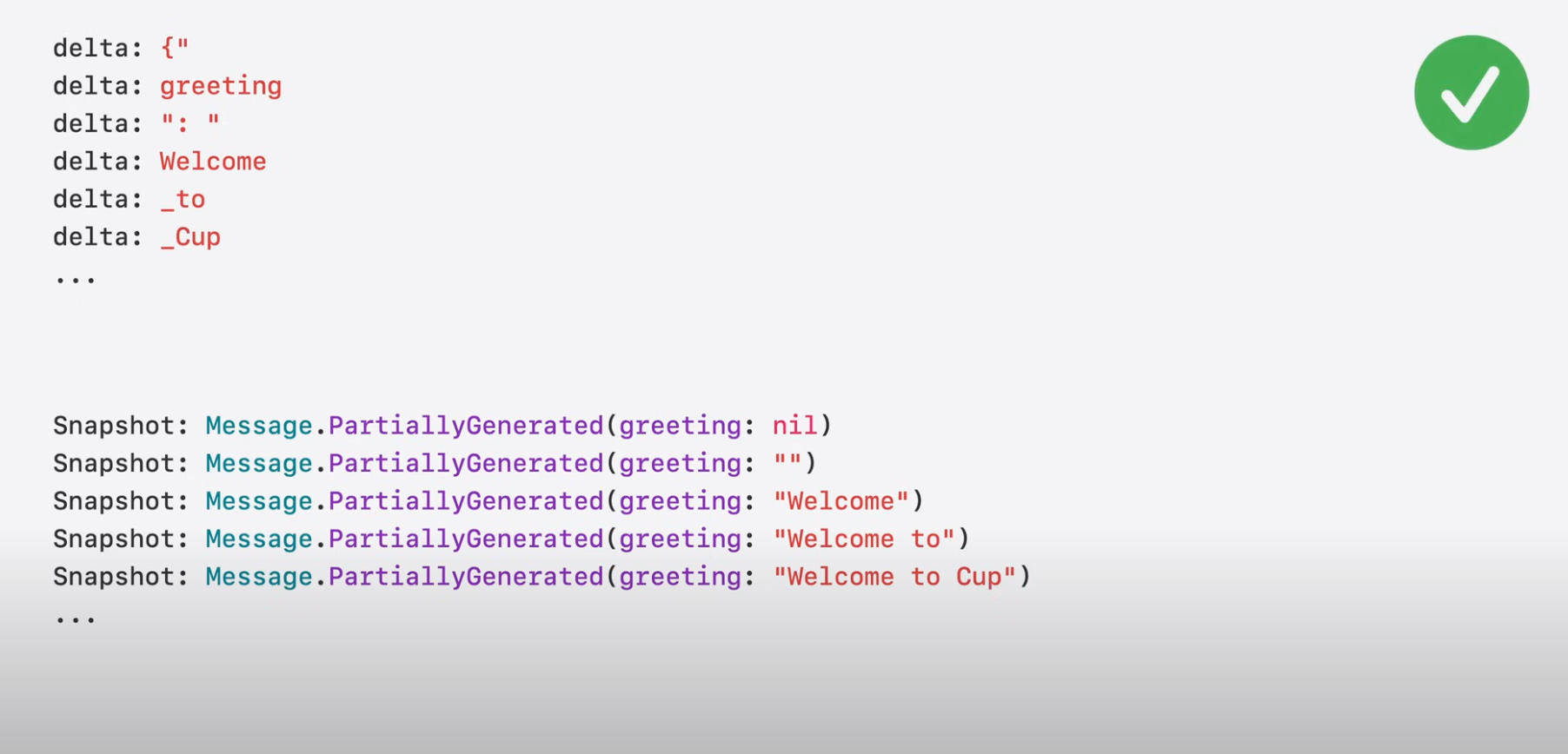 일반적으로 스트리밍 형태로 출력시 토큰은 델타라는 타입으로 전달되지만 FoundationModels에서는 다른 방식을 사용함.