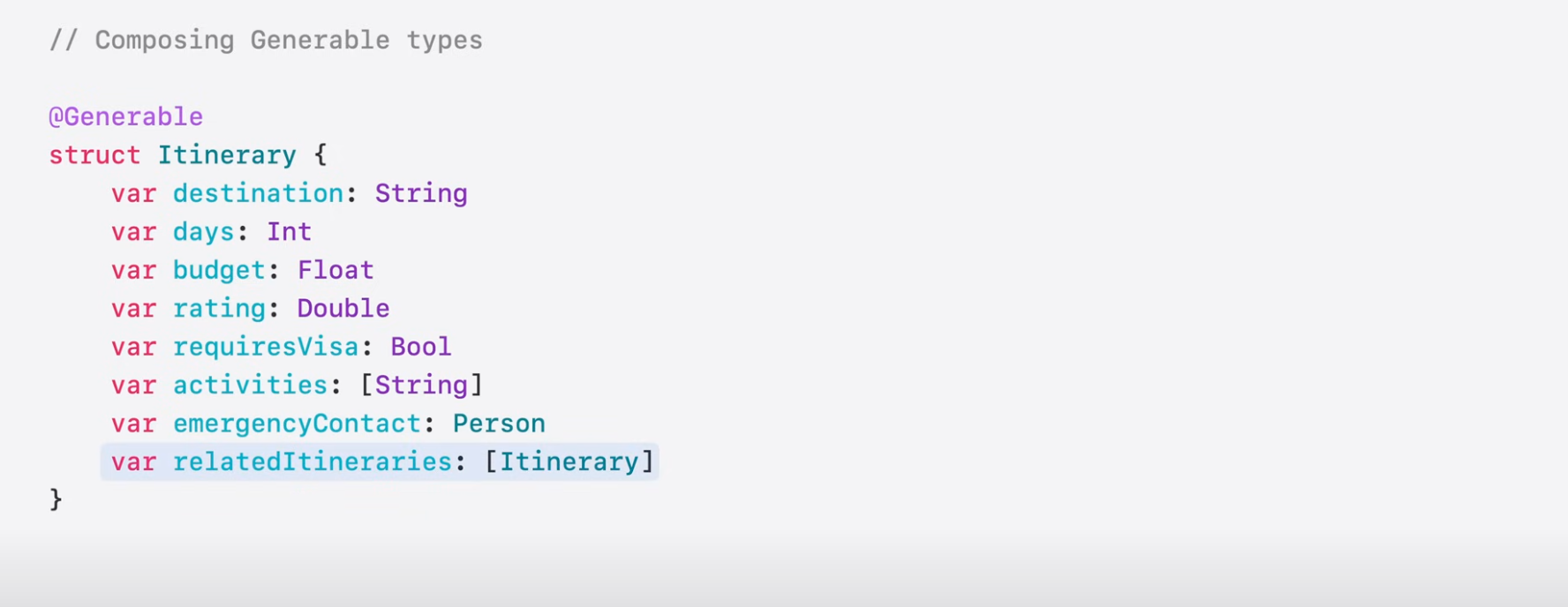 @Generable 타입은 문자열, 정수, 실수 등 기본 자료구조형으로 구성할 수 있음.