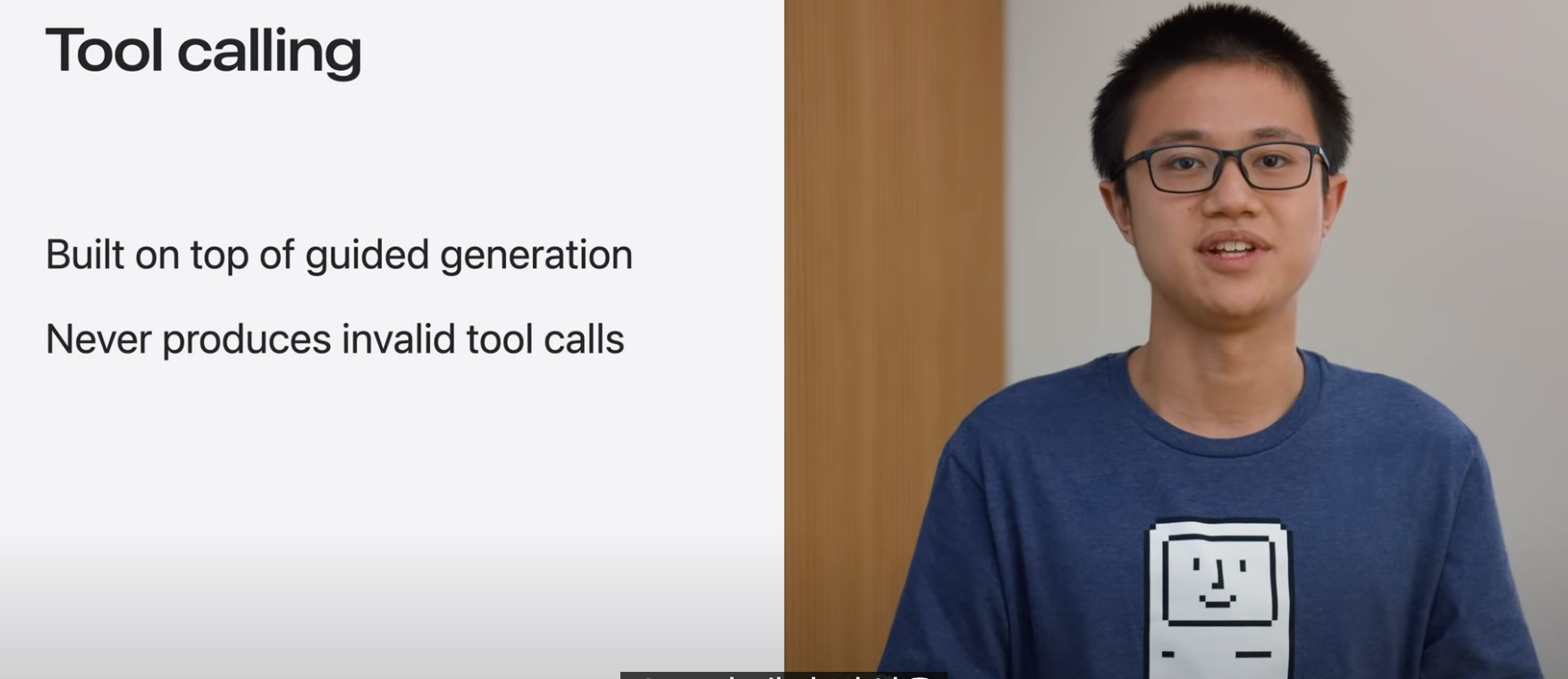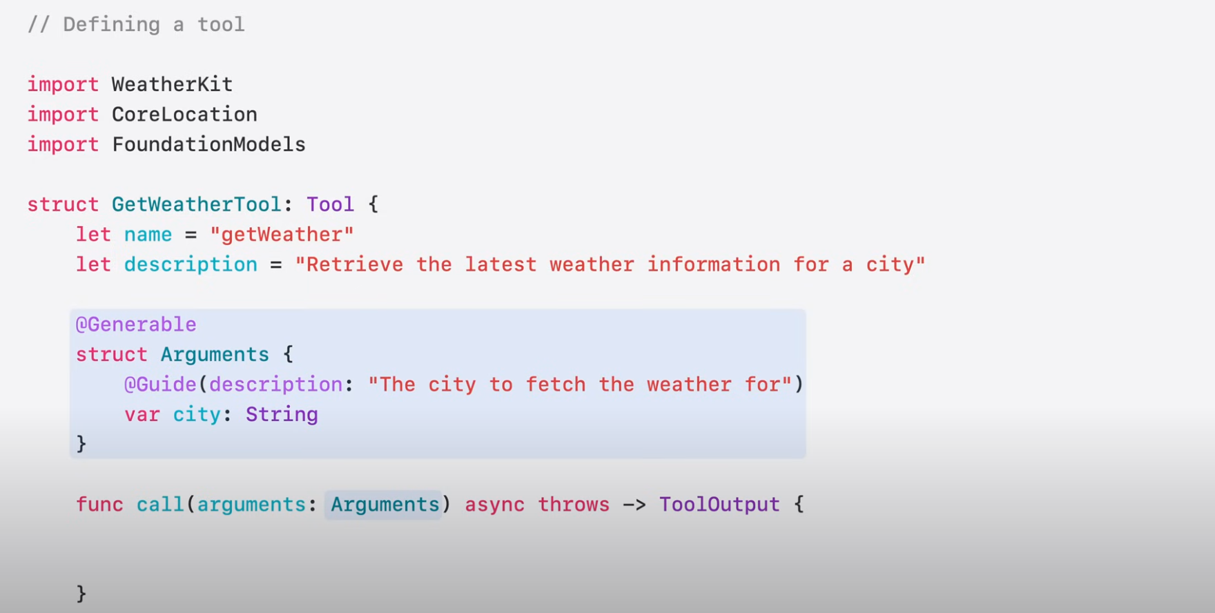 @Generable이어야 하는 이유는 Tool calling 모델이 잘못된 Tool name 혹은 arguments를 생성하지 않도록 guided generation를 기반으로 하기 때문.