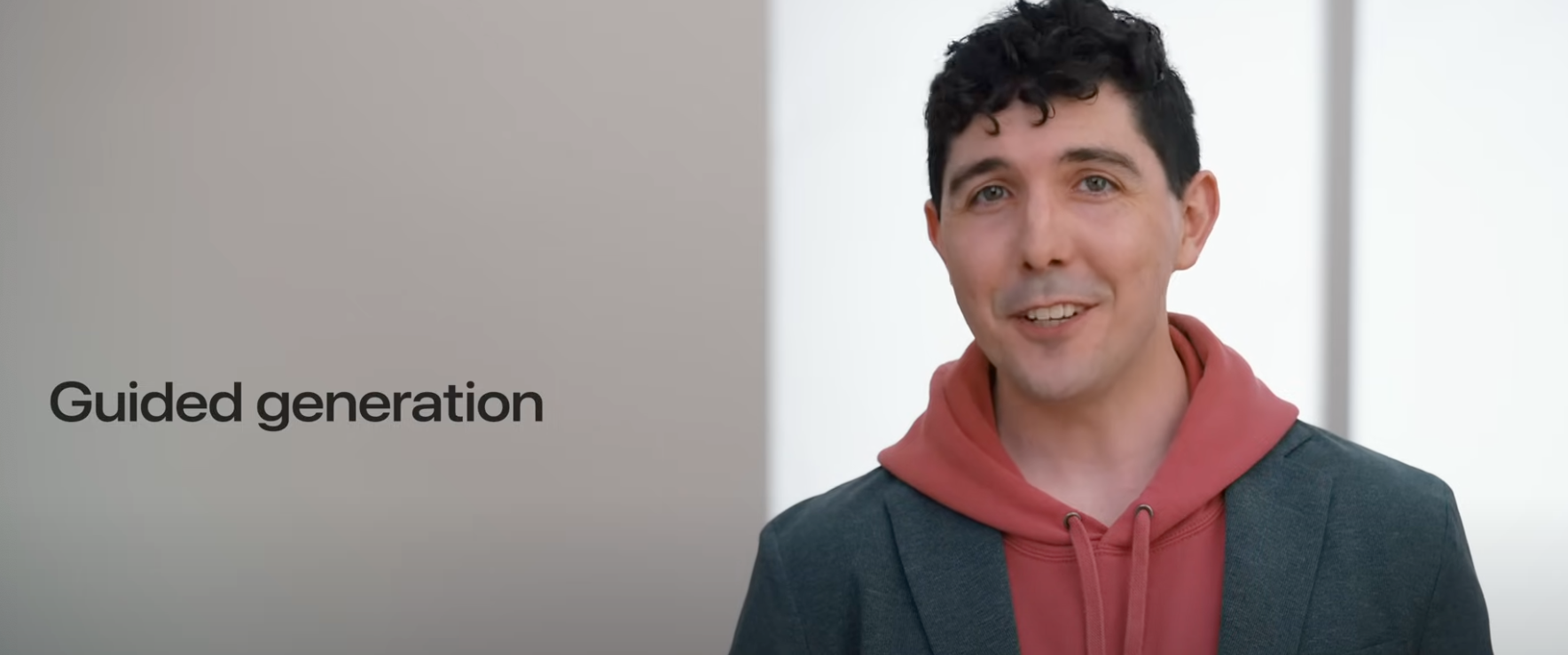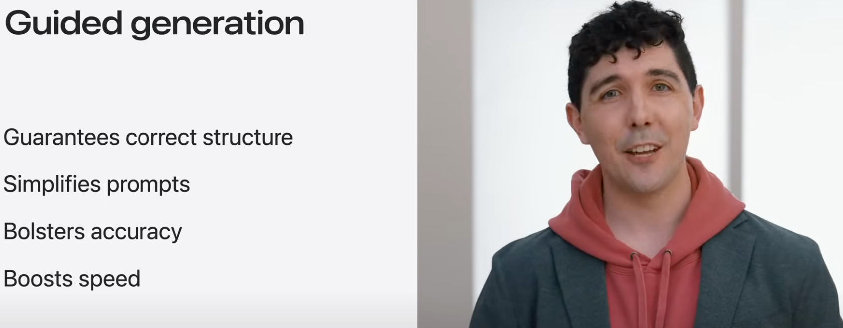 Guided generation에 대해서 알아볼건데 기본적으로 언어 모델은 구조화되지 않은 자연어 형태로 출력되어 사람은 읽기 쉽지만 앱 UI에 그대로 노출하기엔 어려운 부분이 존재함.