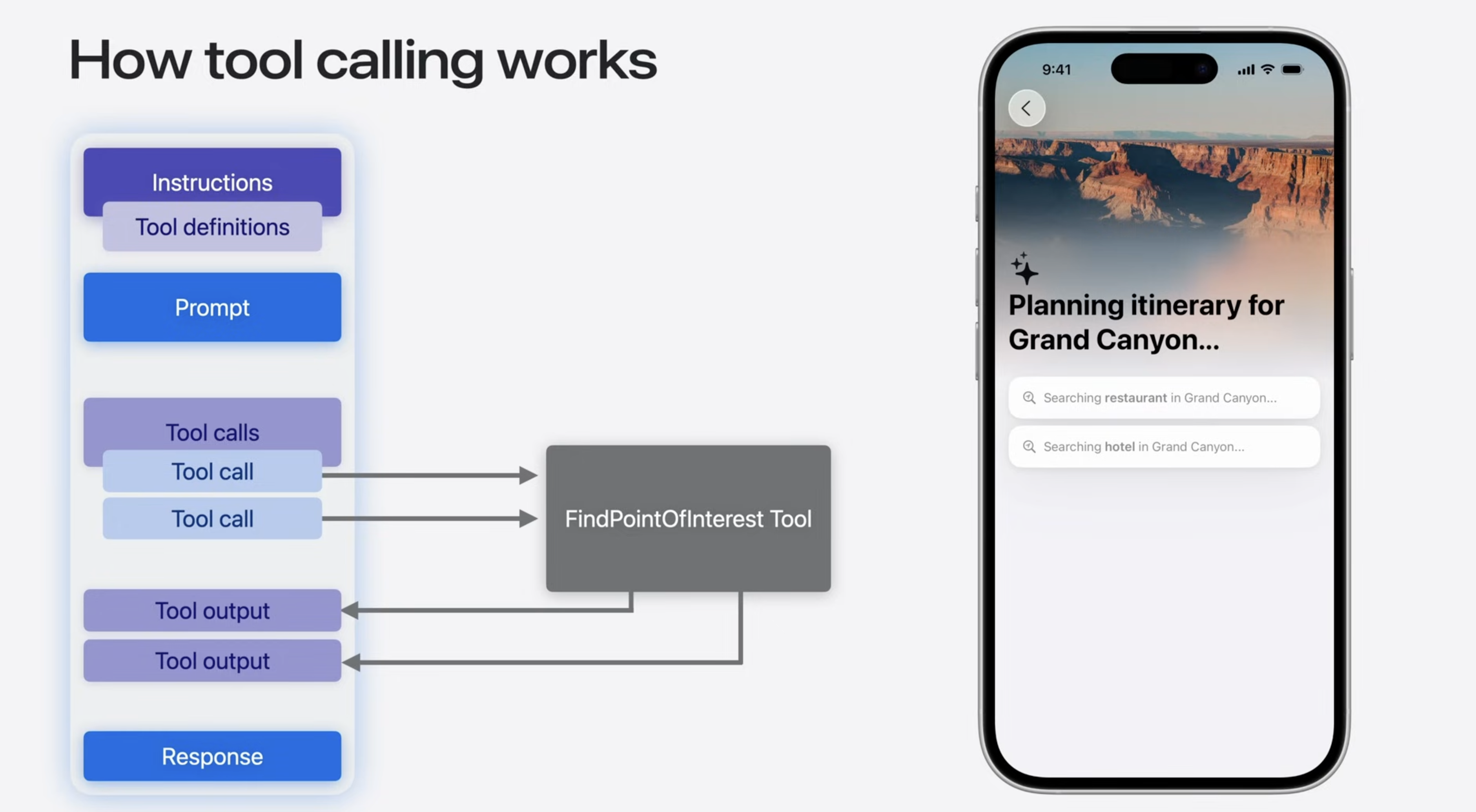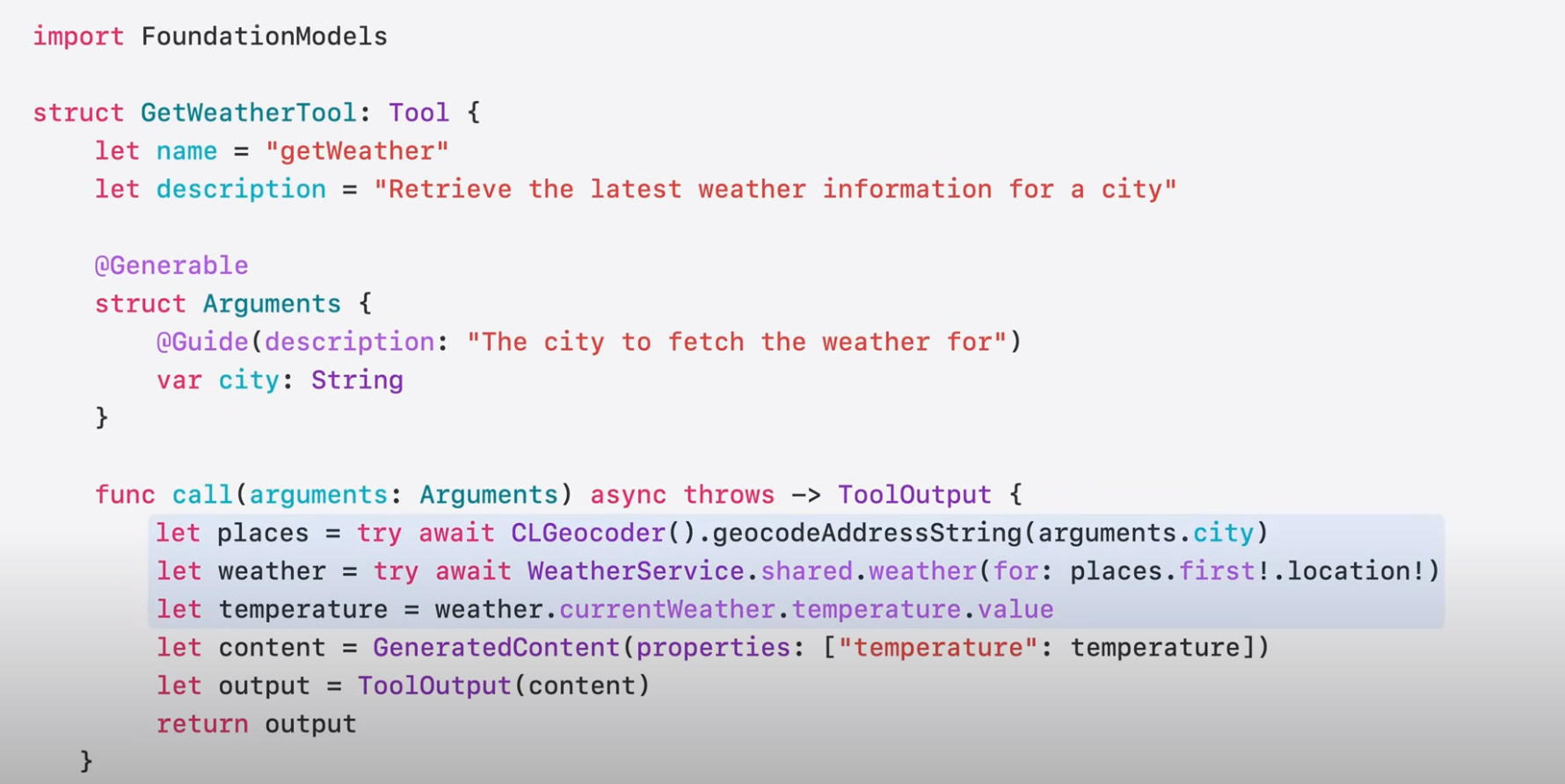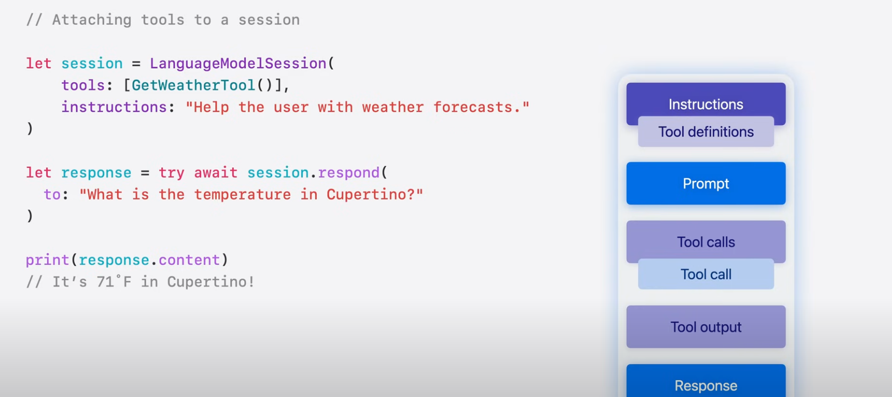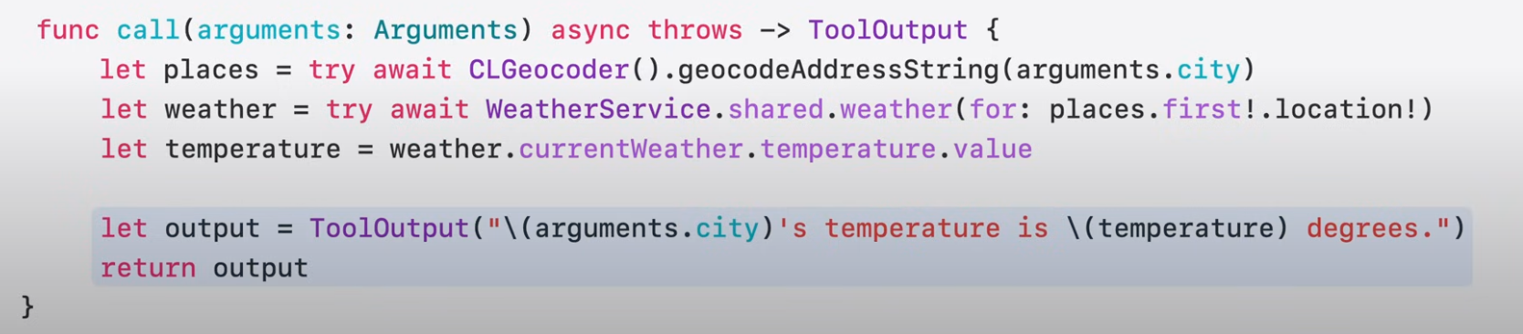 - 이 단계에서 FoundationModels 프레임워크는 Tool을 위해 작성한 코드를 자동으로 호출함.