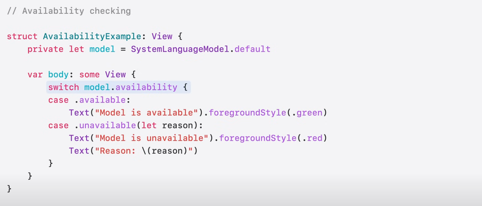 세션을 만들기 전에 모델은 애플 인텔리전스 지원 기기와 지원하는 지역에서만 사용되어서 미리 사용 가능한지 체크해야함.