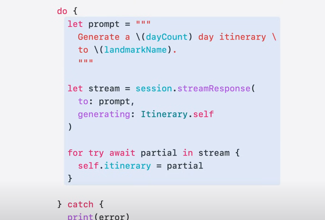 `PartiallyGenerated` 타입은 세션의 streamResponse 메서드 호출에서 사용됨.