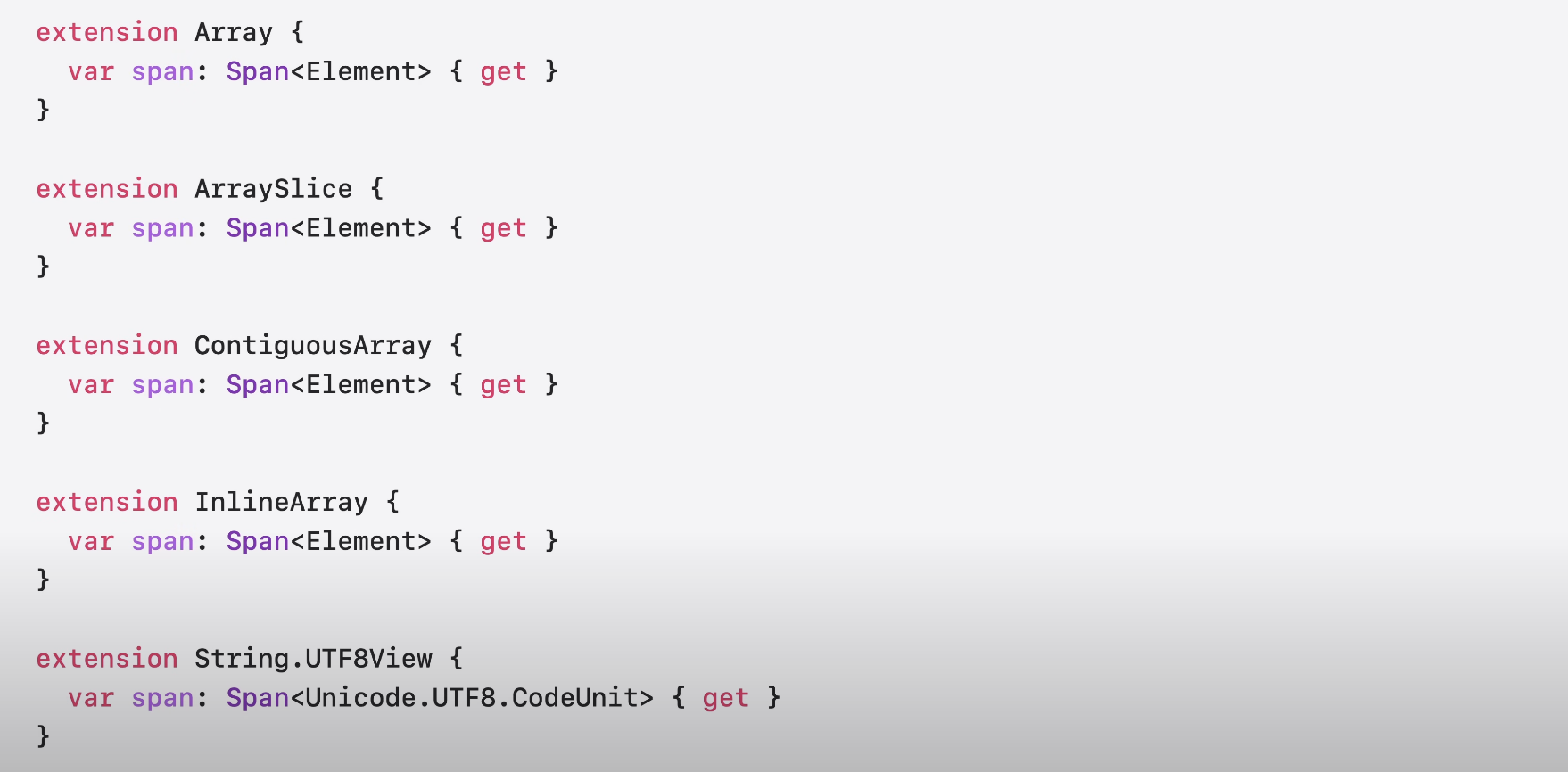 이와 동시에 Swift 6.2에서는 Span과 같이 안전한 유형을 통해 Swift에 API를 불러오는 C 및 C++ 헤더에 대한 새로운 주석도 지원함.