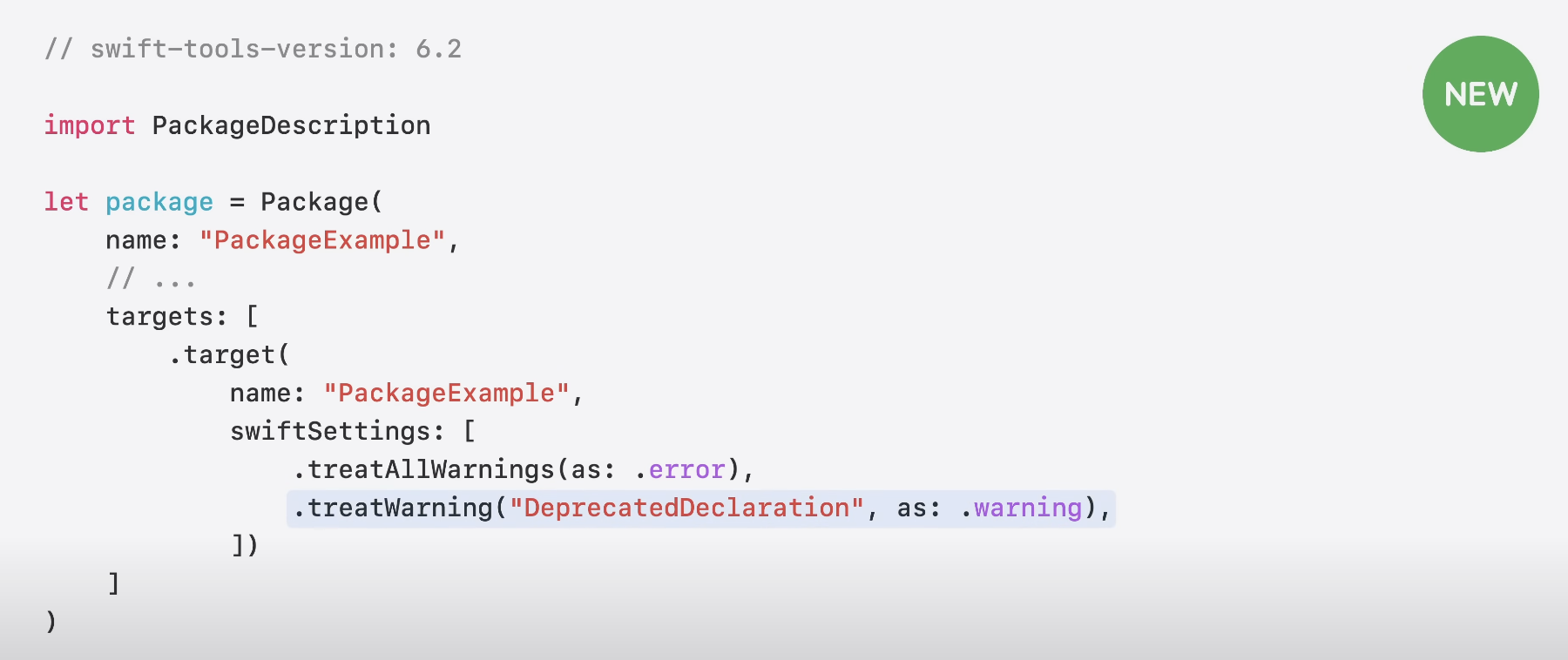 Swift 6.2에서는 안전하지 않은 모드를 알리는 워닝이 추가되었고, 해당 코드는 모드에 필요한 주석은 보안을 위해 어떤 코드 부분이 추가로 필요한지 식별하는데 도움이 됨.