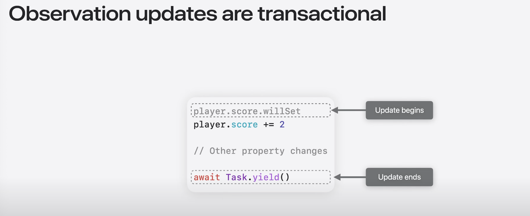 Observation은 Transaction 단위로 수행되는데, willSet이 호출될 때 시작되며, Task.yield시 종료됨