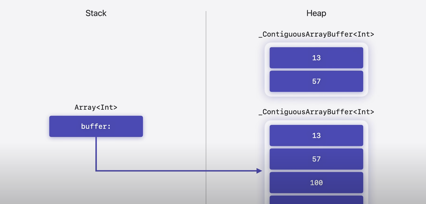 배열을 사용할 때는 동적 크기 조정을 지원하기 위해서 배열은 힙 할당 버퍼에 대한 참조를 저장함.