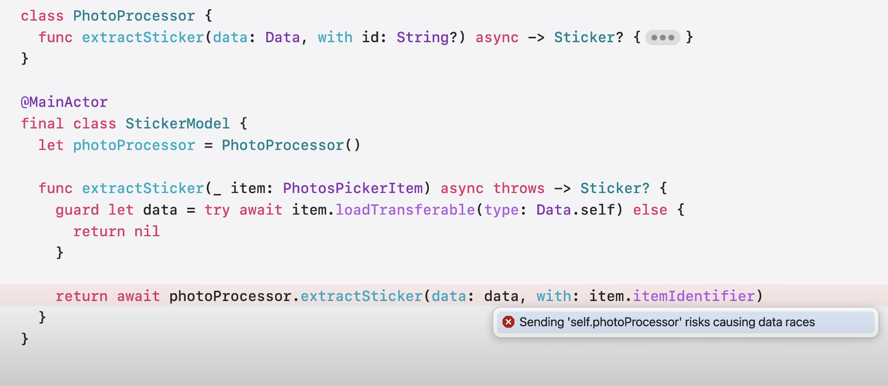 언어는 MainActor로 부터 홀출될 수 있는 것으로 가정했고, StickerModel이 MainActor 상태를 사용하지 못하도록 함.