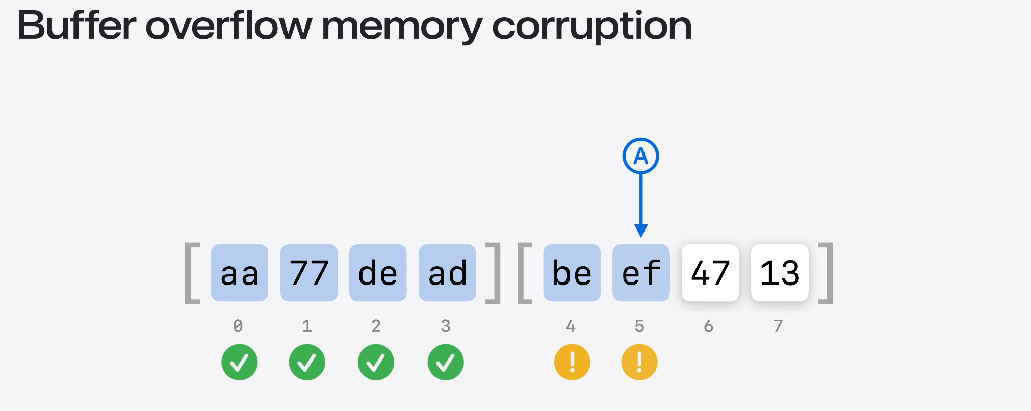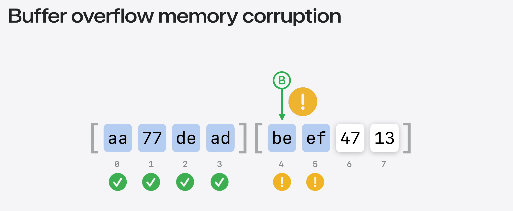 예를 들어 버퍼 오버플로우는 버퍼의 경계를 넘어 다른 할당의 메모리를 손상시킴.