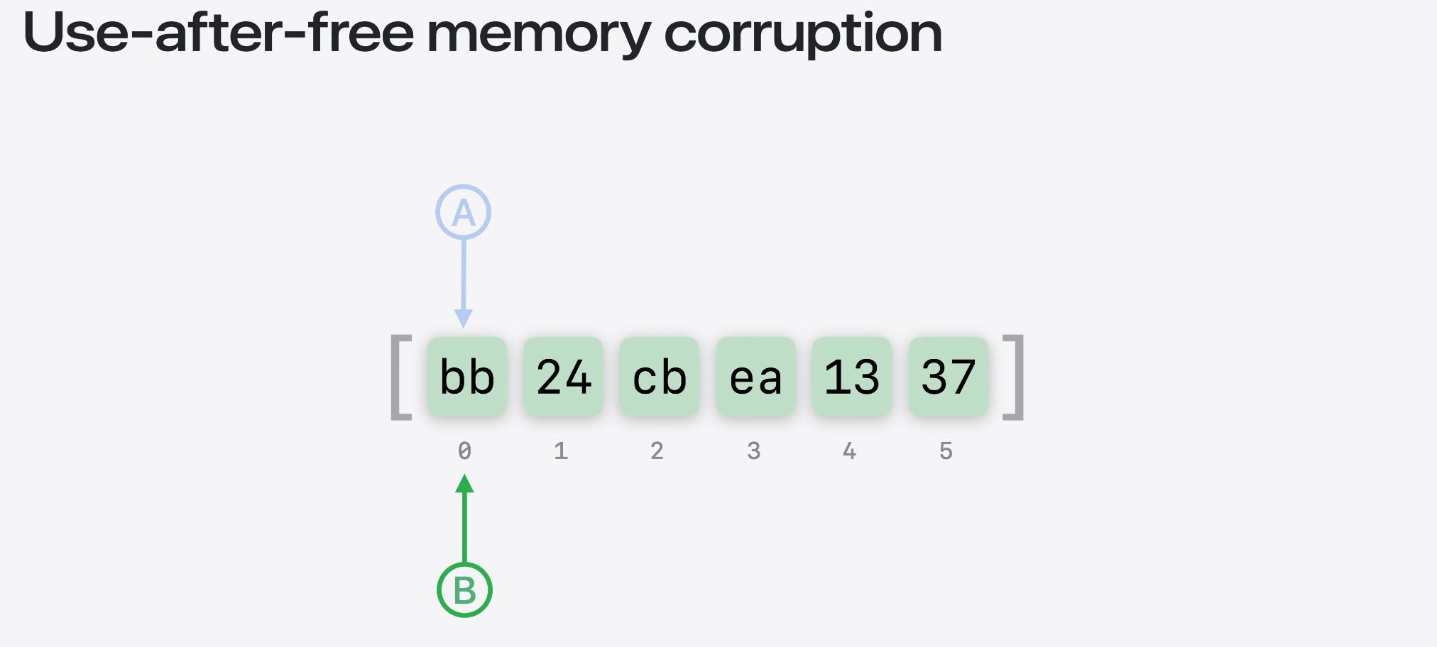 : 앱이 메모리의 동일한 위치에 새로운 할당을 생성할 경우, A의 dangling pointer를 통해 읽거나 쓰면 메모리가 손상됨.