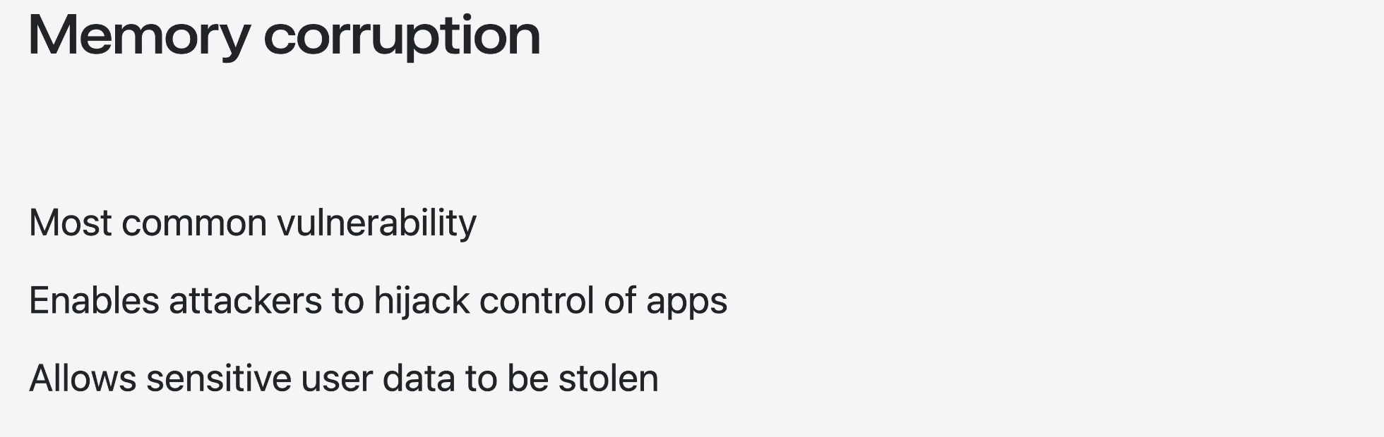 : Most common vulnerability (메모리 손상) > 공격자는 메모리 버그를 이용해 앱의 제어권을 장악하고 사용자의 민감한 데이터를 훔칠 수 있음.