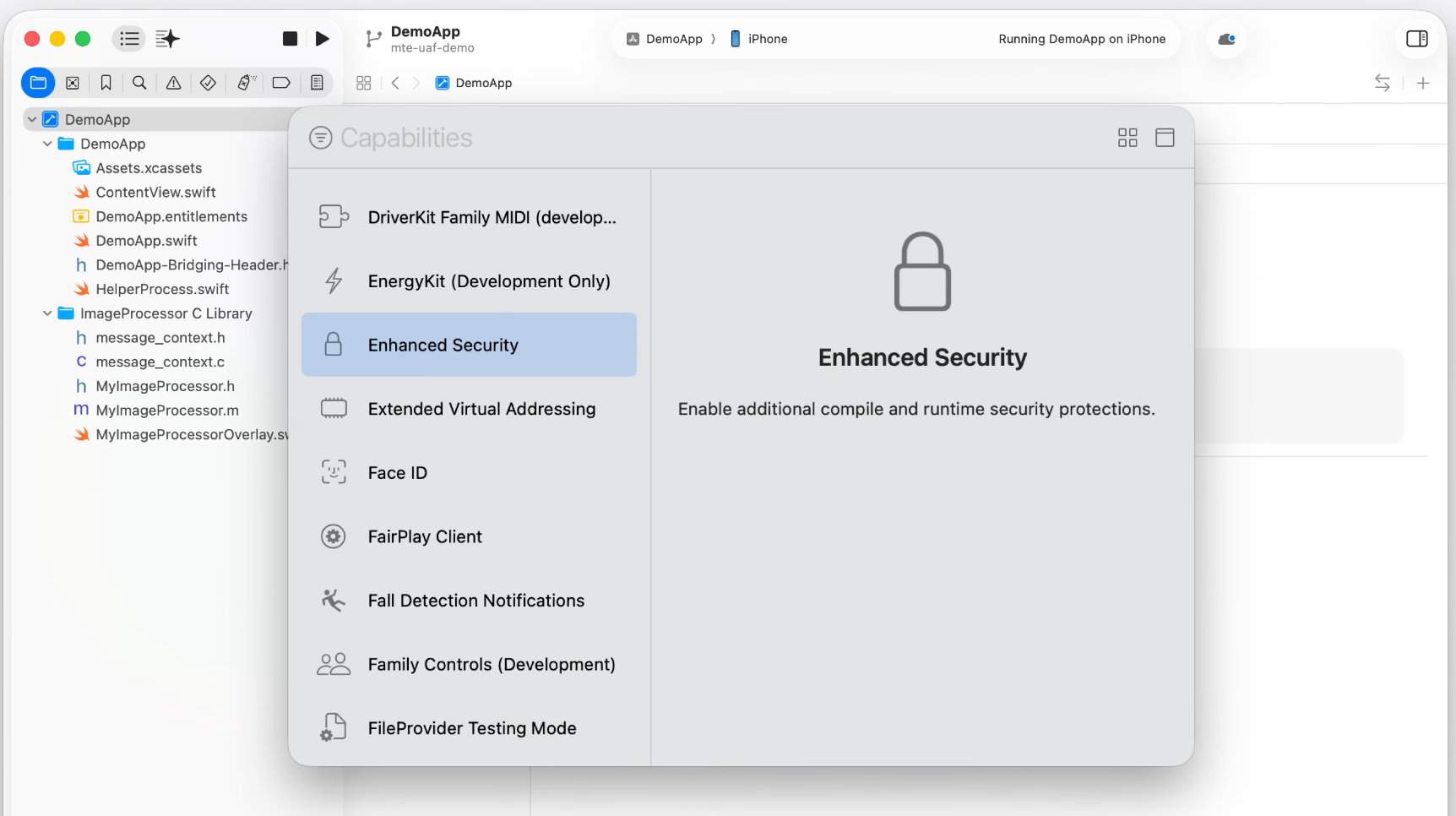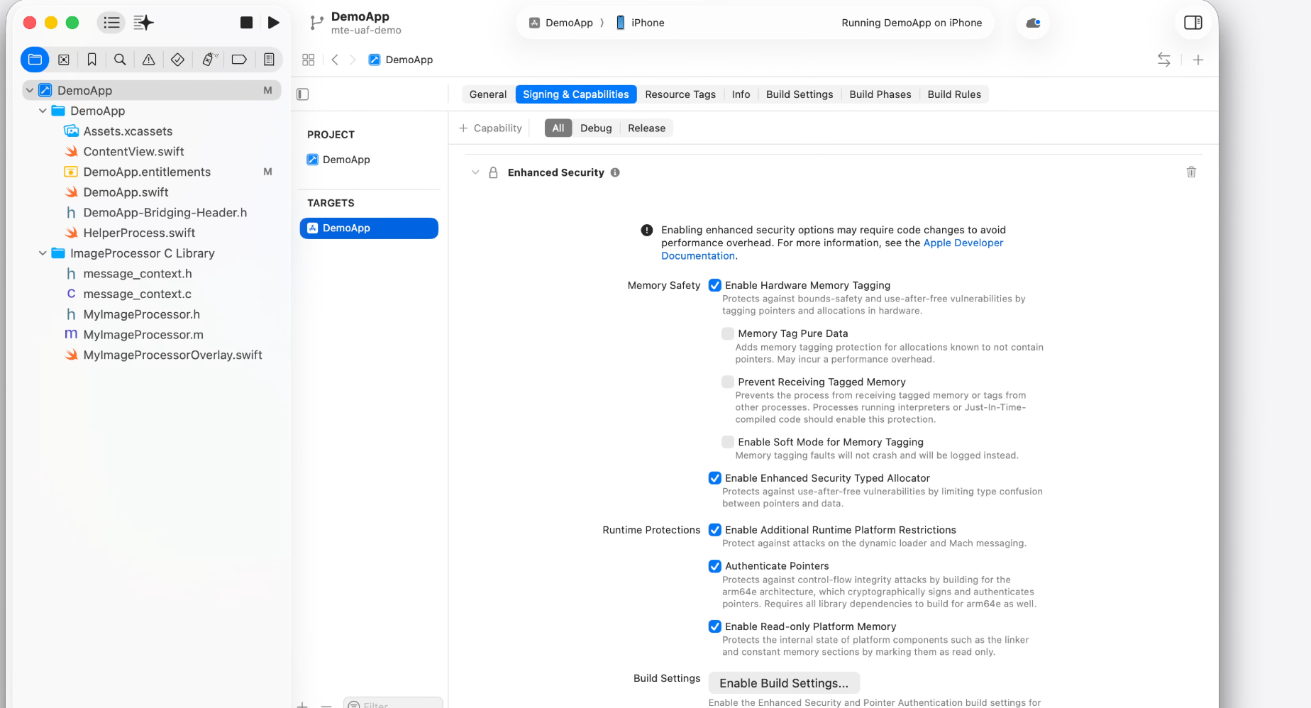 Xcode에서 메모리 무결성 적용을 통해 앱을 보호하려면 앱 Targets의 Siging & Capabilities에서 Enhanced Security를 추가함.