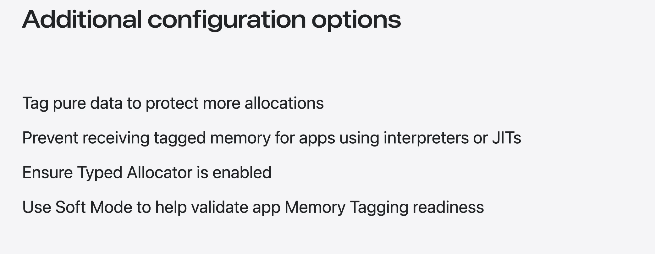 : 이를 통해 하드웨어 메모리 태깅을 포함한 여러가지 강력한 보안 보호 기능을 사용할 수 있음.