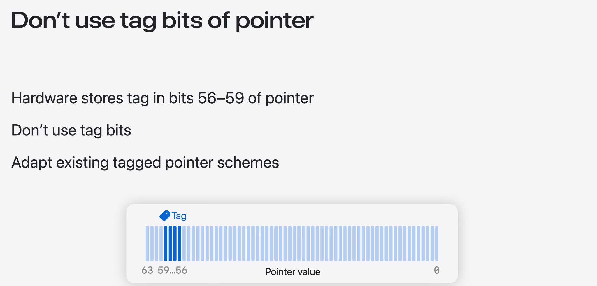 하드웨어 메모리 태깅을 할당을 보호하기 위해 포인트 상위 비트에 태그를 저장.