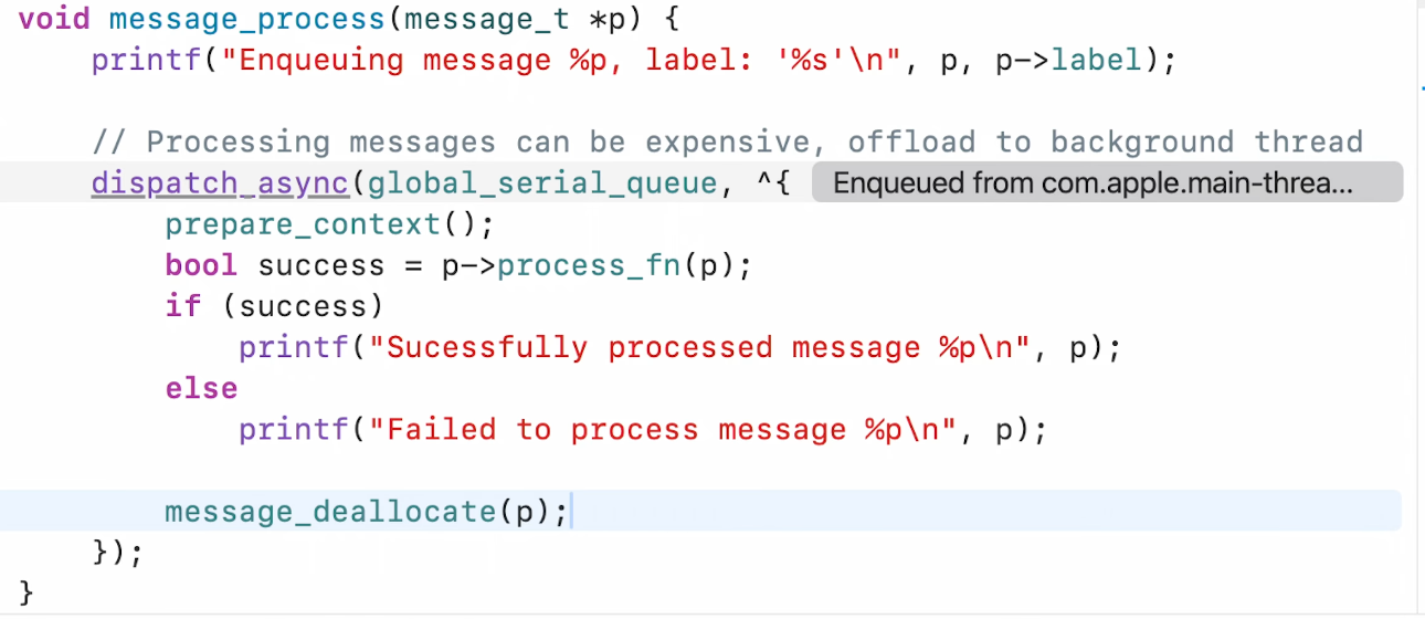 하지만 문제는 비동기로 실행하면서 백그라운드 스레드가 메시지를 처리할 기회를 갖기 전에 메인 스레드가 메시지의 할당을 해제함.
