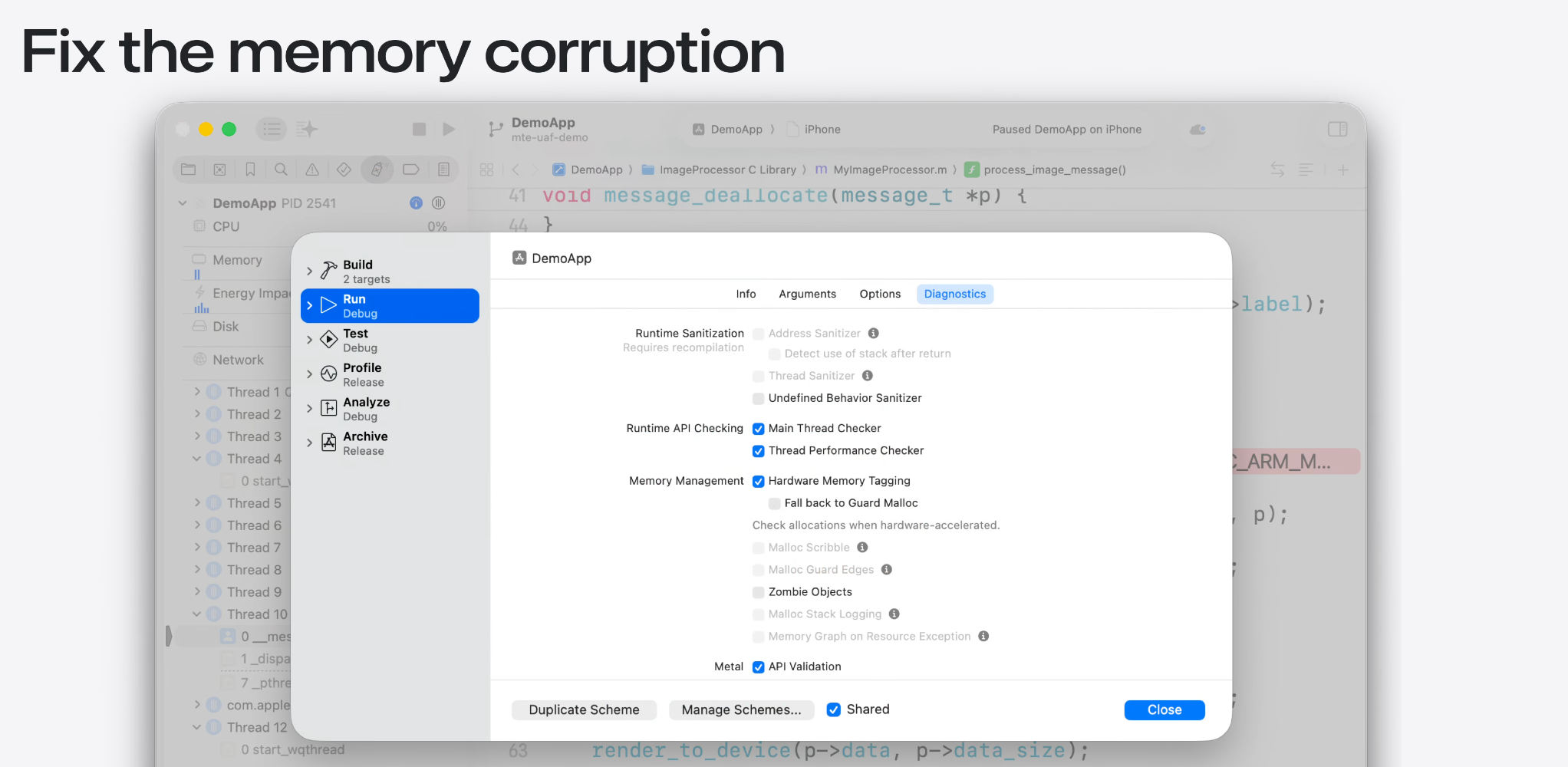 Edit Scheme > Diagnostics 에서 Hardware memory Tagging을 활성화