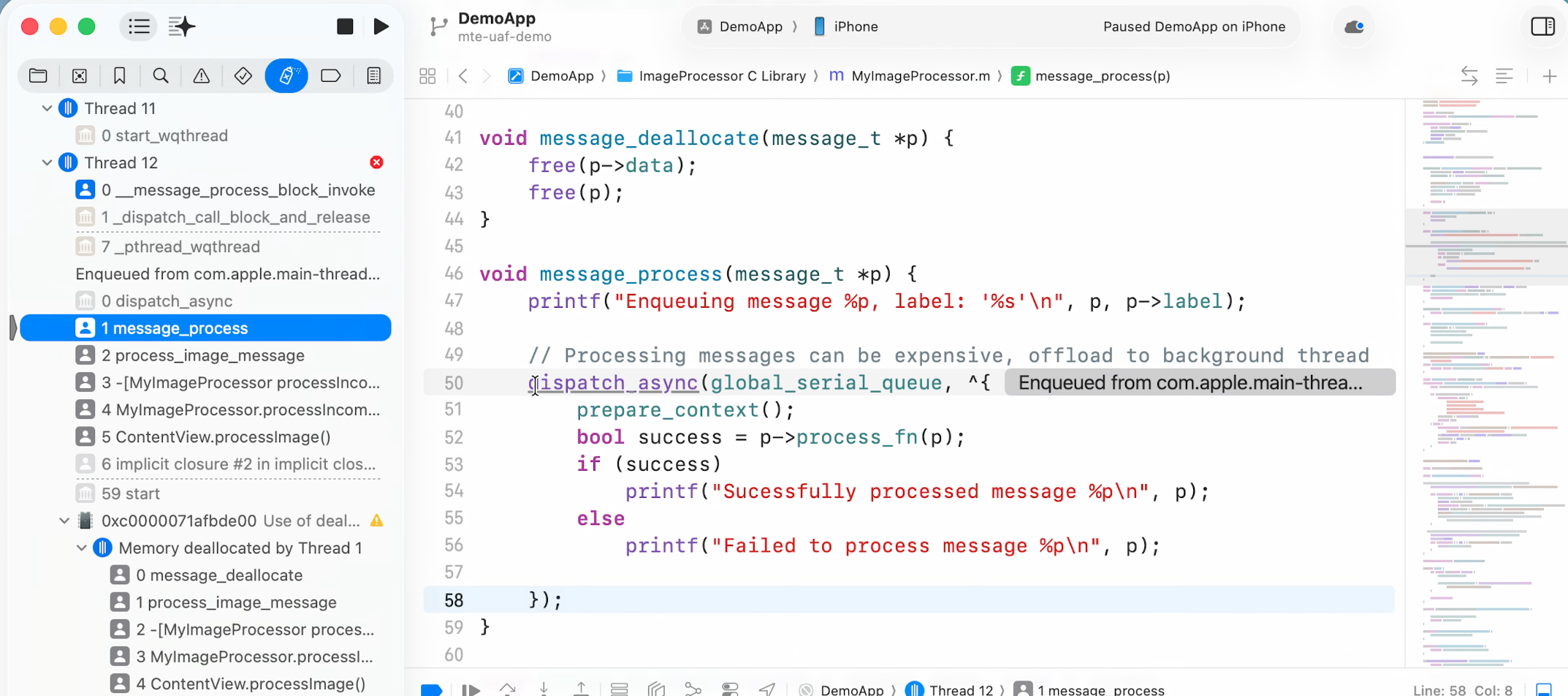 문제를 해결하려면 메시지의 할당 해제를 메인스레드에서 비동기 블럭의 끝으로 코드롤 옮겨서. 처리가 완료된 후에만 할당 해제되도록 변경.