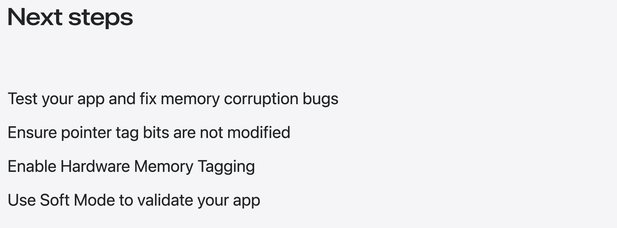 : 앱 정상적으로 사용할 때 오버플로우나 버그를 수정할 때 하드웨어 메모리 태깅 진단을 활성화해서 버그를 파악할 수 있음.