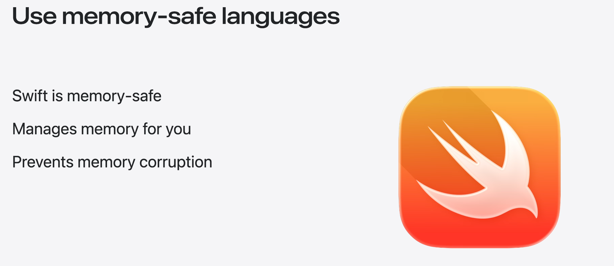 Swift와 같은 안전한 언어를 사용하거나 메모리 안전 언어는 메모리를 관리하여 프로그래밍 실수로 인해 메모리가 손상되는 것을 방지함.