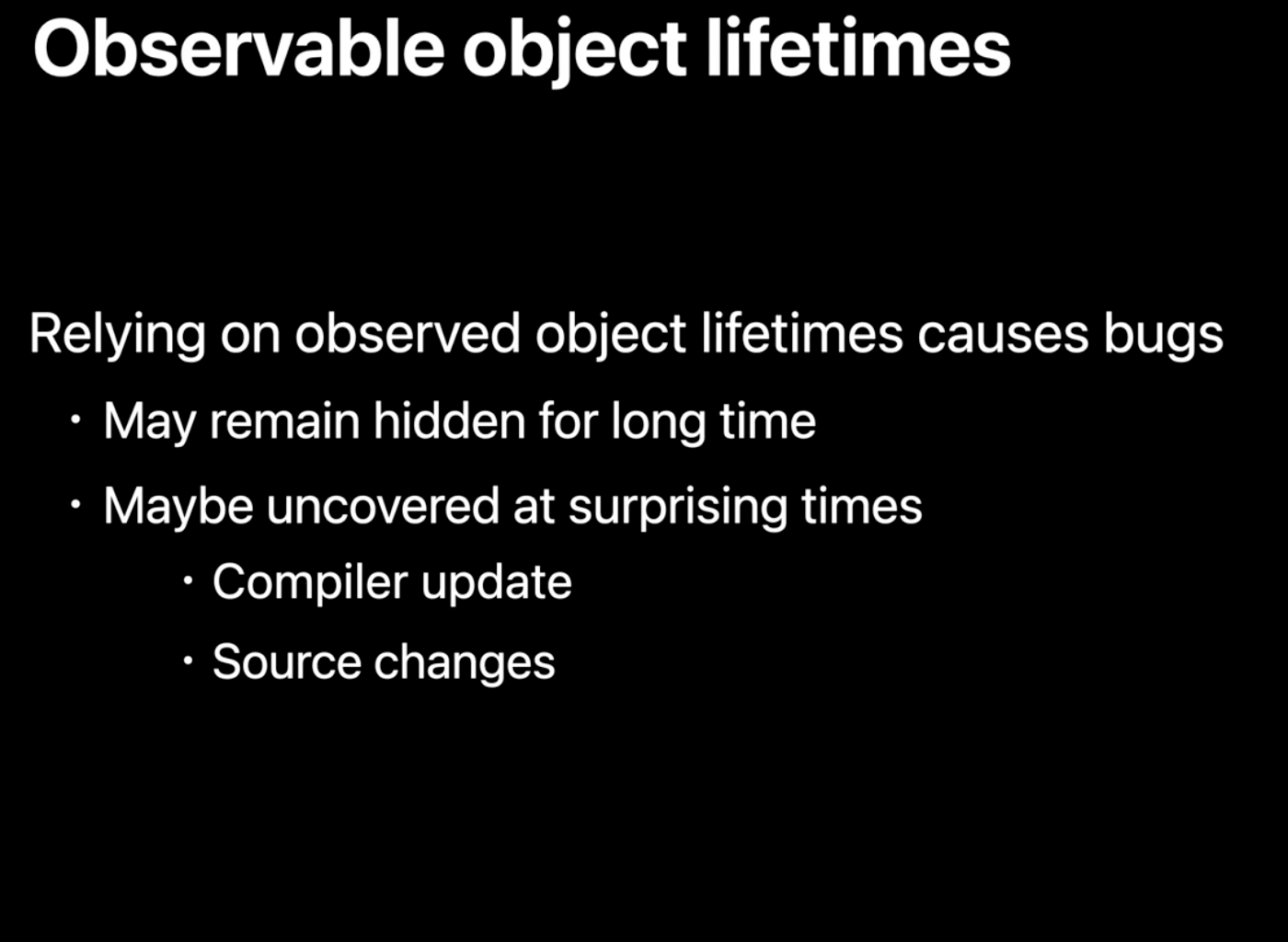 : ARC최적화나 컴파일러 업데이트 등에 의해서 어느날 갑자기 문제가 발생할 수 있음.