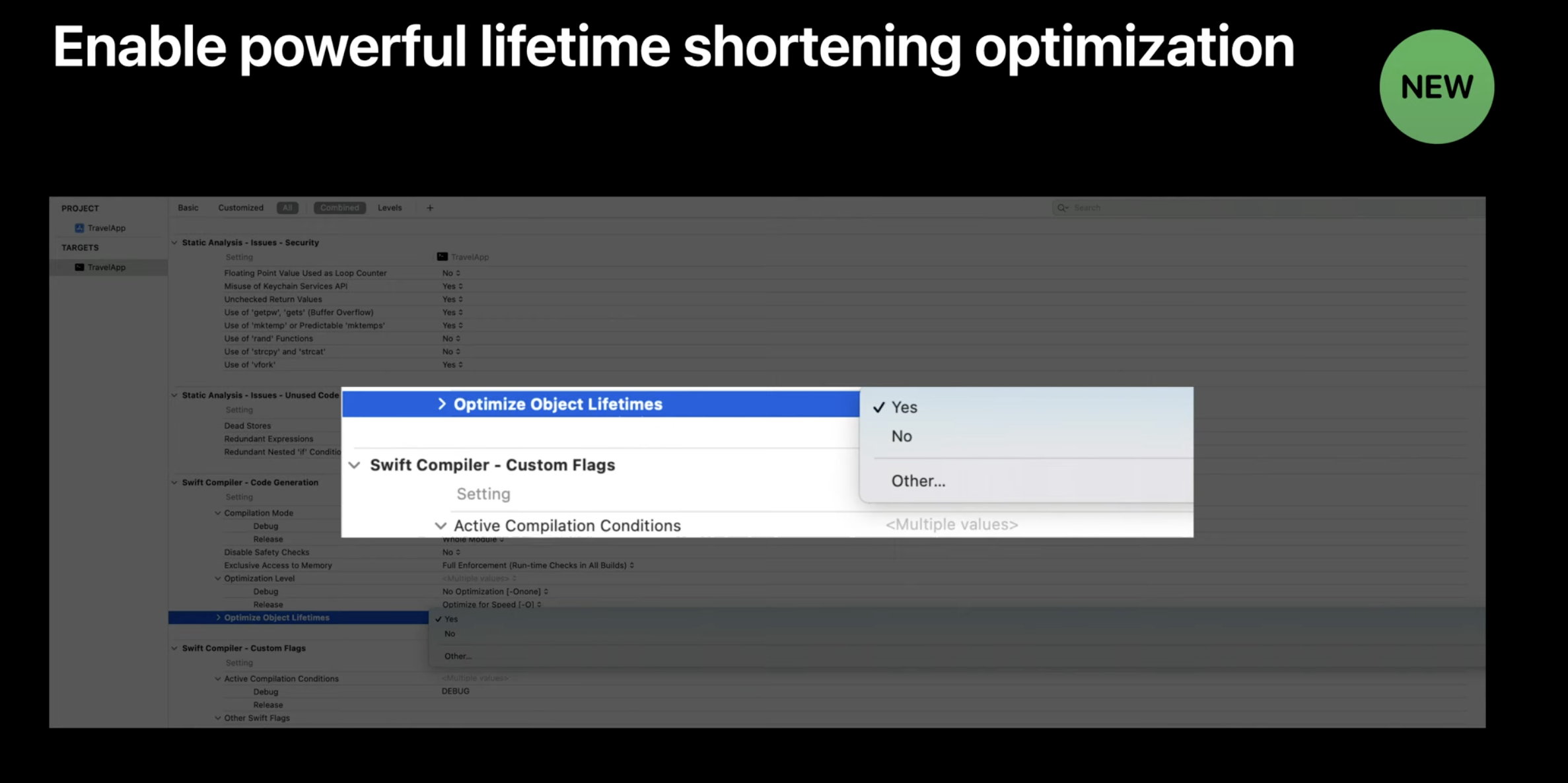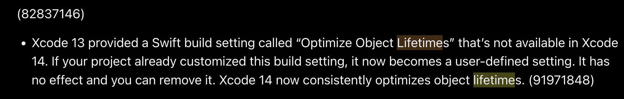: Xcode 13에서 Optimize Object Lifetime가 등장했으나 Xcode 14에서는 해당 옵션이 최적화로 항상 적용되고 사용자에 의해 적용된 옵션은 무시되었으며, Xcode 26 기준으로는 사용할 수 없음.