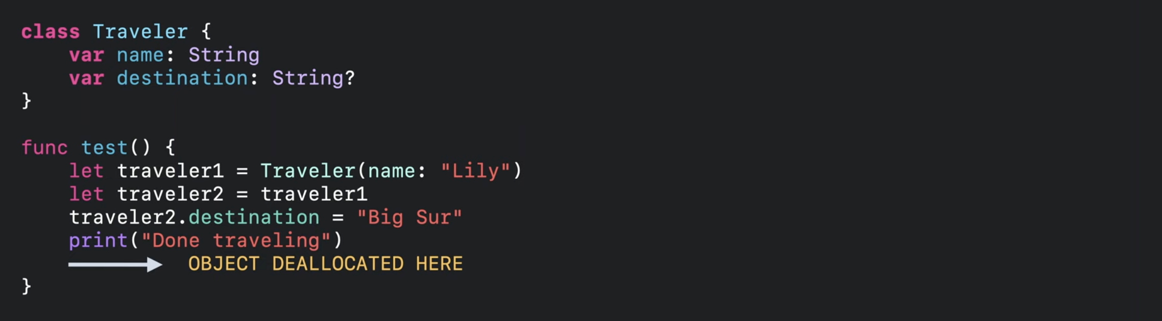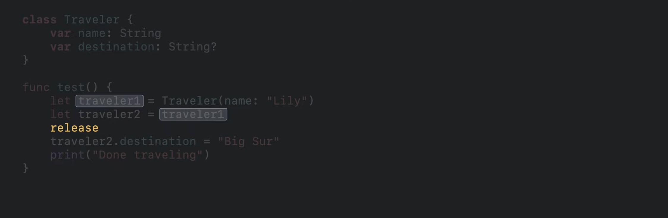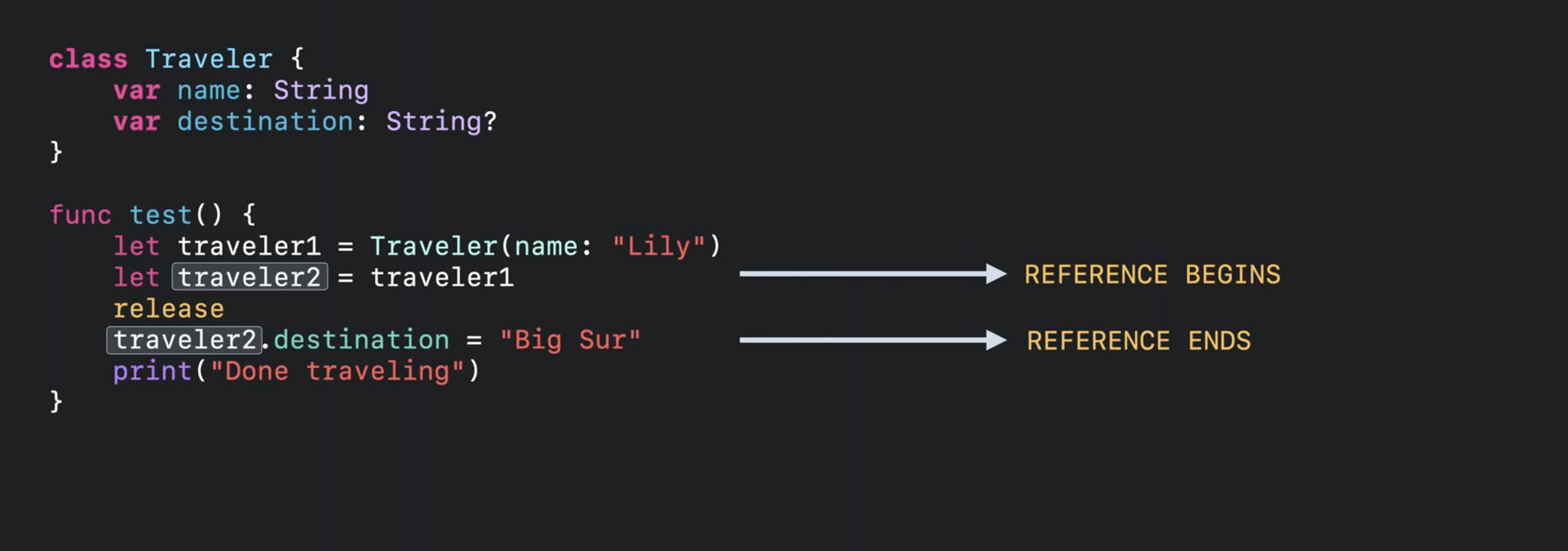 Swift 컴파일러는 traveler1 참조의 마지막 사용 직후에 relase 작업을 삽입함.